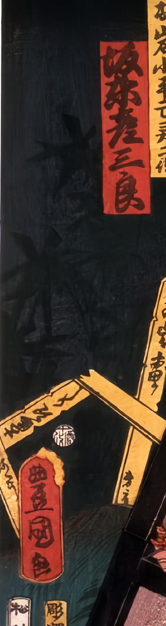 One famous nue attack occured in the summer of 1153 in Kyoto. Emperor Konoe began to have nightmares every night, and grew very ill. Neither medicine nor prayers had any effect on his illness, and the source was attributed to some kind of evil spirit which was visiting the palace every night, early in the morning. These events climaxed some days later in a storm which appeared over the imperial palace around 2 AM. Lightning struck the roof, setting it on fire. The emperor summoned the legendary samurai Minamoto no Yorimasa, to deal with the evil spirit. Yorimasa brought his trusted companion, I no Hayata, and his legendary bow which he received from Minamoto no Yorimitsu, to hunt the best. During the night, a strange wind came over them, followed by a black cloud. Yorimasa fired his arrow into the clouds above the palace, and out from the sky came a horrible scream as a nue dropped to the earth. I no Hayata leaped upon the body, dealing it a finishing blow. The emperor immediately recovered from his illness, and rewarded the heroes with the legendary katana Shishiō for their service. This event has been immortalized in numerous paintings and ukiyoe prints.