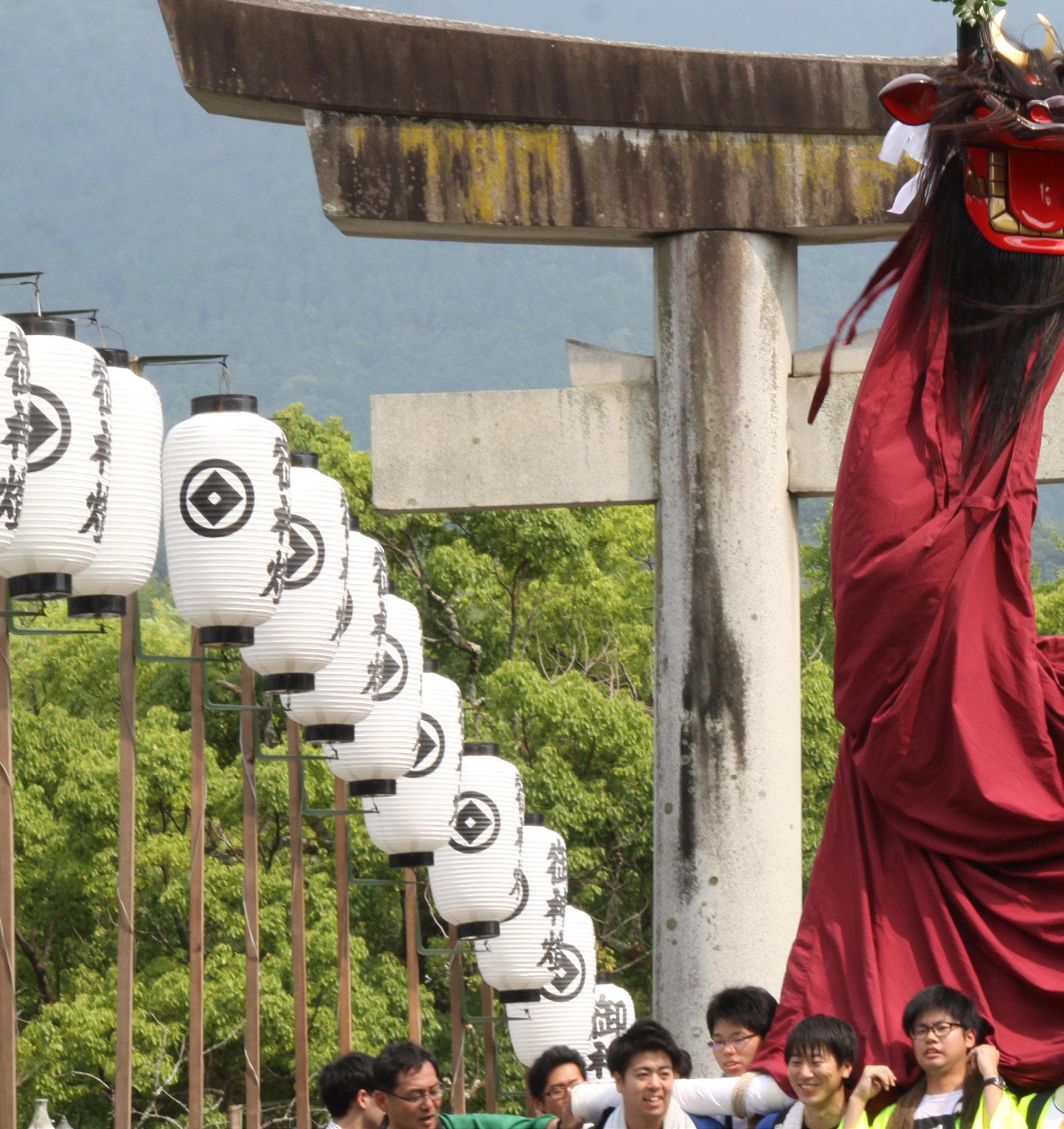 Each festival day centers on different activities including a youth float parade (involving smaller ushioni floats), music and dance, bamboo pole climbing competitions, and fireworks. The floats are highly interactive. Attached to a long neck that extends from the float’s enormous body, the ushioni head swings across crowds of people creating delight among tens of thousands of spectators. The festival’s roots are in Warei Jinja’s four hundred-year-old rituals where smaller scale ushioni are purified by shrine priests to dispel negative spirits and bring blessings to the community. Once admitted, they chase family members, roar, and call out children for laziness or misbehavior. In 1965, the city of Uwajima developed the Ushioni Matsuri as a public festival to increase tourism and boost the local economy. More than that, the festival brings local communities together to compete, to collaborate, and to celebrate; it is a source of community enjoyment, identity, and pride. The festival’s roots are in Warei Jinja’s four hundred-year-old rituals.