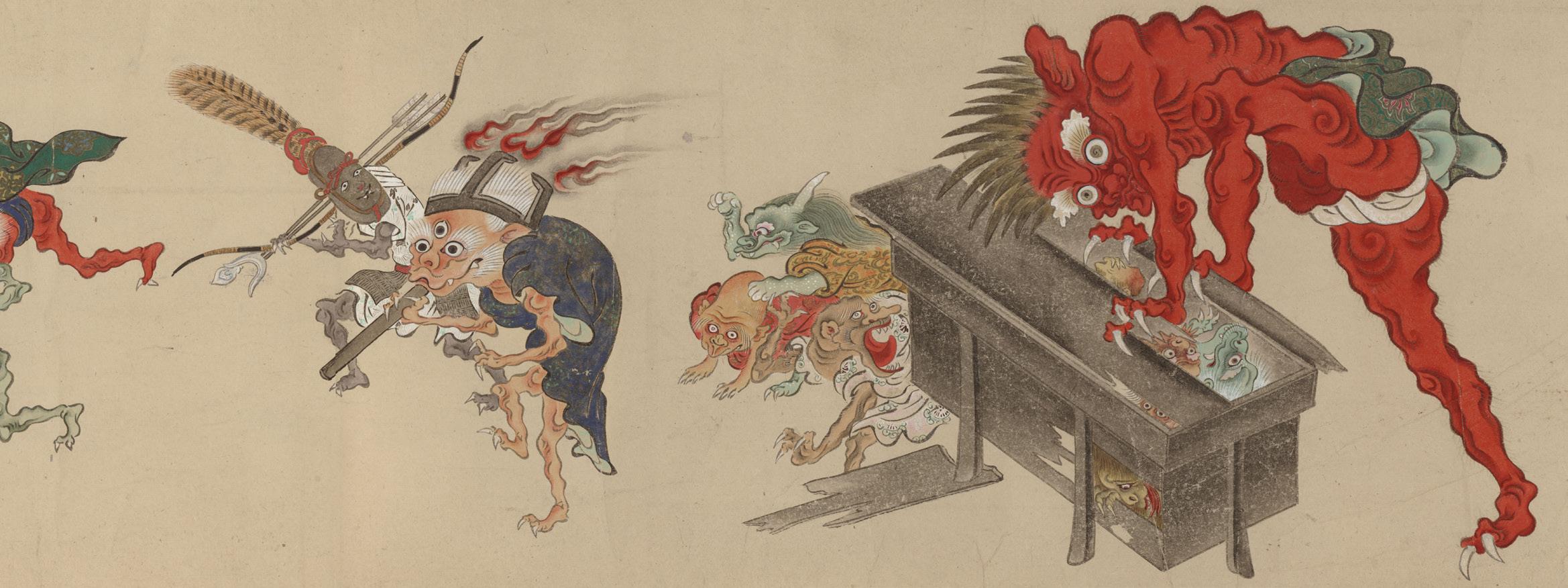 The repertoire of bizarre creatures in Japan was expanded by painters of the Muromachi period (1336—1573). These artists borrowed traditional characters found in serious religious images, such as horned and hideous demons (oni), and added to the assortment by illustrating oral tales of inexplicable phenomena and weird beings. These monster paintings transformed religious subjects into entertaining ones, creating funny monsters engaged in other human activities.