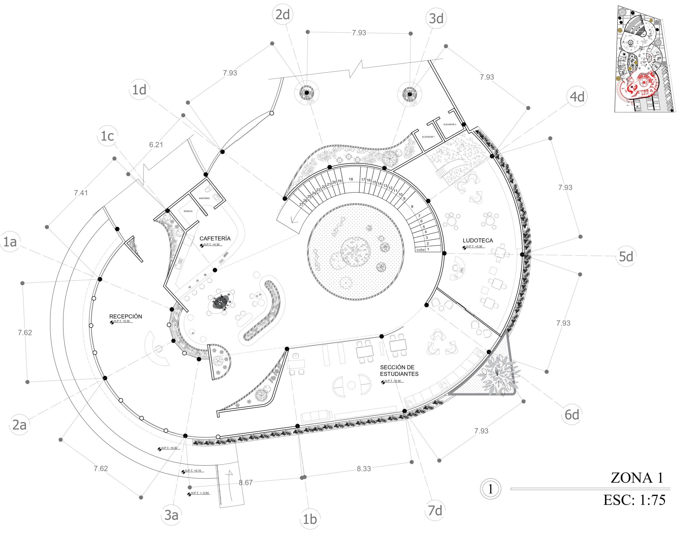 En el primer bloque, ubicado en la sección izquierda del museo, se encuentra el área administrativa. Aquí se han designado espacios como ocinas, salas de juntas y una sala de recreación para los empleados. Estas instalaciones administrativas permiten que el personal del museo lleve a cabo sus labores de manera eciente y organizada. Además, se han incluido bodegas de archivos para el resguardo de la documentación y registros necesarios para el funcionamiento del museo. Esta sección del museo se ha concebido como un espacio privado, destinado exclusivamente para el personal autorizado.