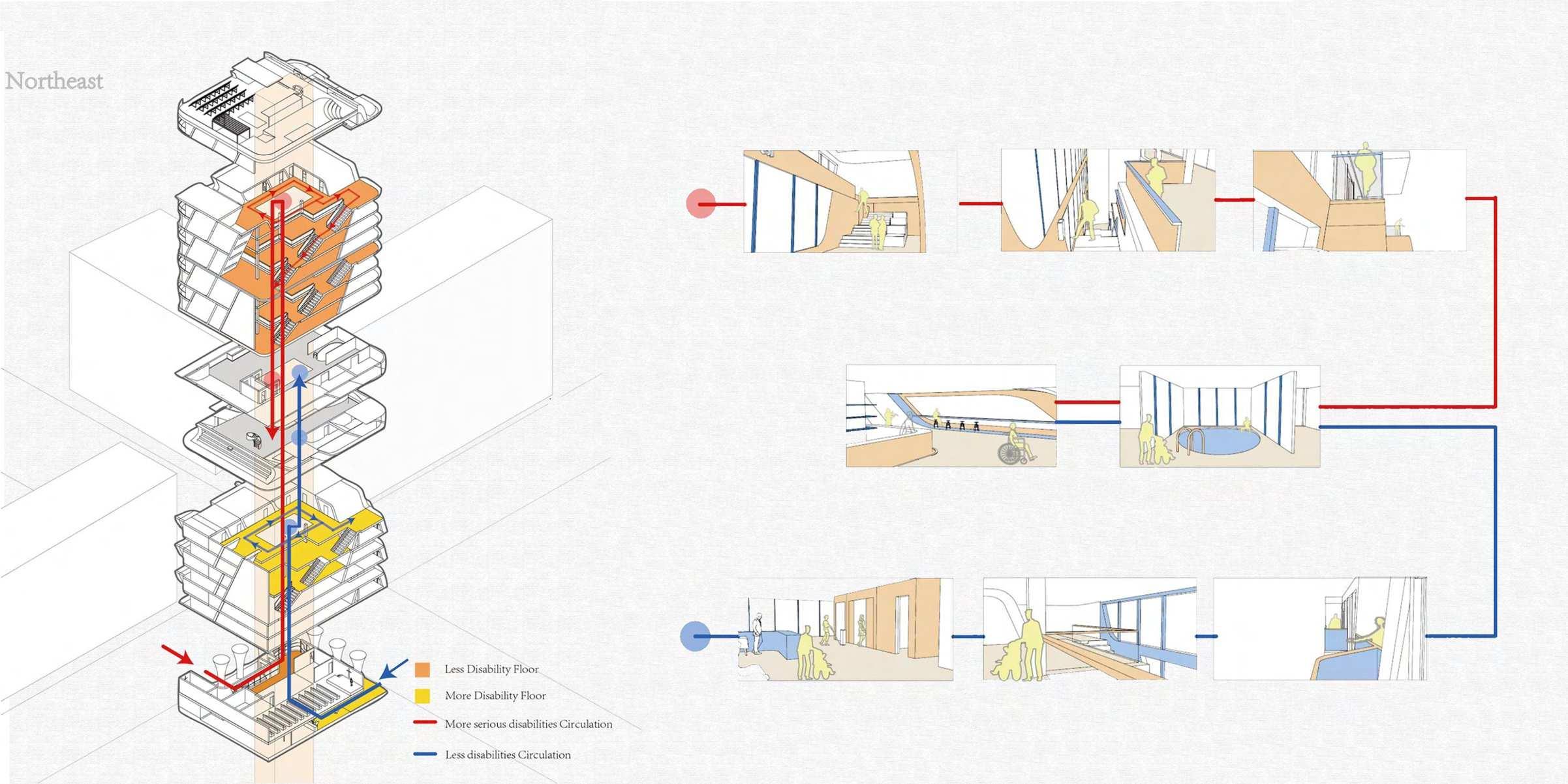 Here in the circulation diagram, the red line symbolises seniors with less disabilities, and the blue line elderlies with more disabilities. People have different level of disabilities will experience the building in different ways. You can see here, mostly, elderlies with less disabilities using stairs more often after saying hi to people dancing on the lawn outside, then taking the elevator, They walk down the atrium to interact with people on different floors, then go back to their own unit. However, people with a serious disability prefer to take elevators, then they probably stay within two floors since it' s harder for them to move, finally go back to their own units. When they go to the large public space, their route overlaps, so they can have interaction with each other. Also you can see in the plans that people are so interactive witt elderlies and caretakers can have aces to them while having privacy.