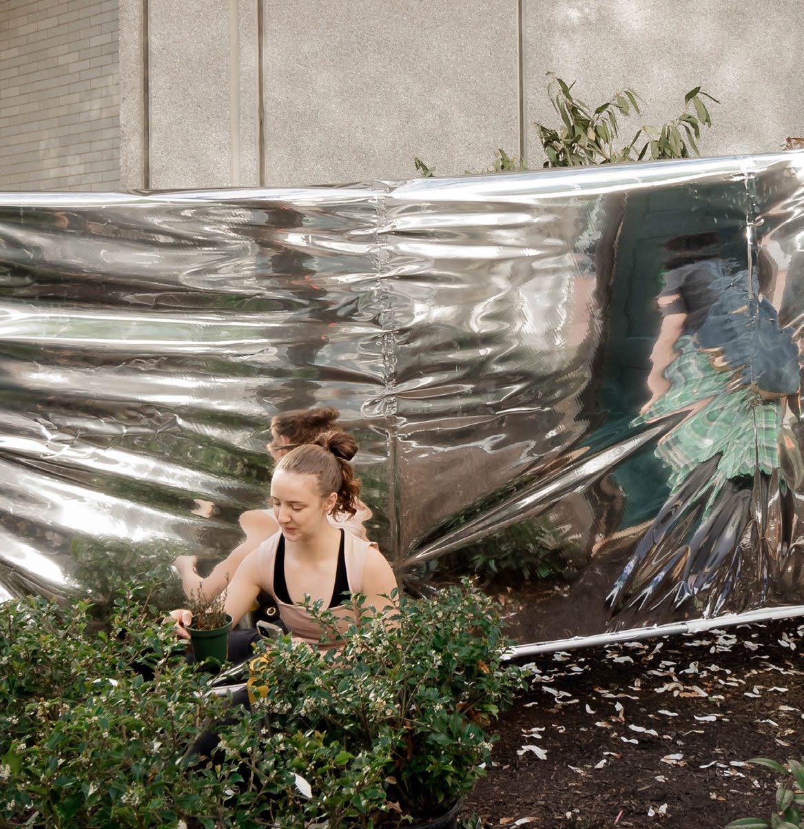 Reflections of the plants keep morphing because of the winds and movement of mylar