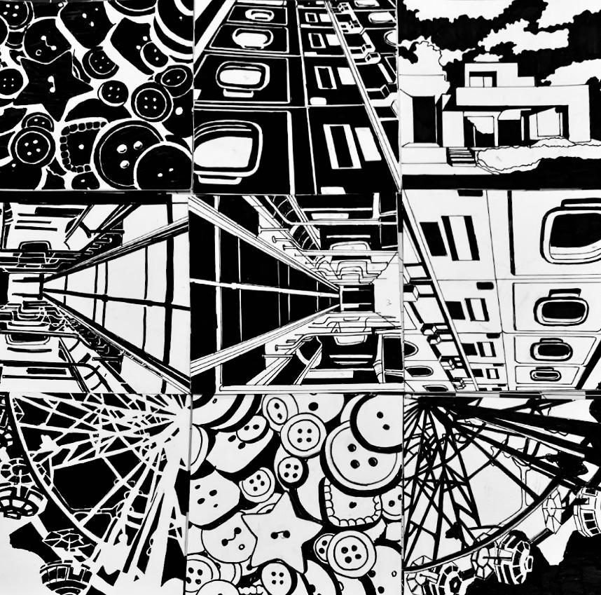 The single images that were used for the piece are listed at the bottom and some of the variations using the smaller squares are shown at the top.