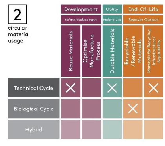 of components and materials MATERIAL SUPPLY PRODUCTION USE ASSEMBLY Raw material extraction CIRCULAR LIFE CYCLE PHASES END OF LIFE Material recycling Design for reconfiguring/ upgrading of components Design for recycling/ upgrading of materials Design for reuse