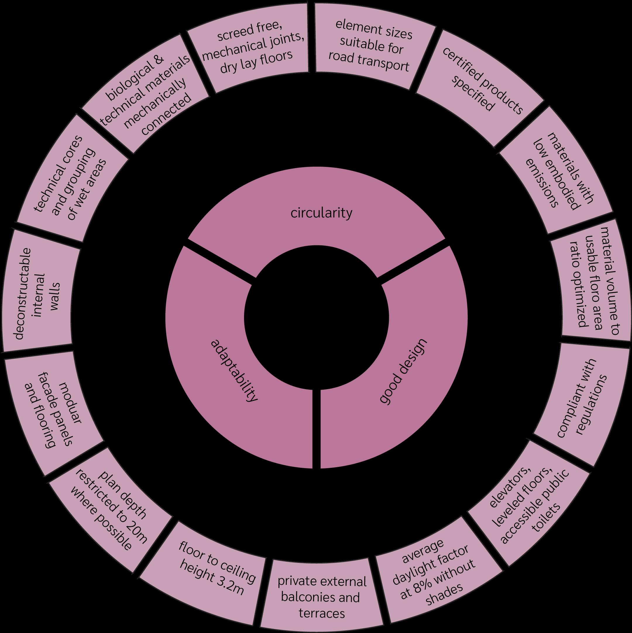The key strategies and parameters encountered will be combined to form an evaluation tool which will be tested by the design of a case study project set in Berlin, Germany. The life cycle of materials will be researched to understand their related emissions, waste materials, and energy involved at every stage. The design of connections will be explored to understand how a building can be taken apart and reused or adapted. The design will be evaluated using quantitative data from simulations and calculations and qualitative data based on predefined design parameters.
