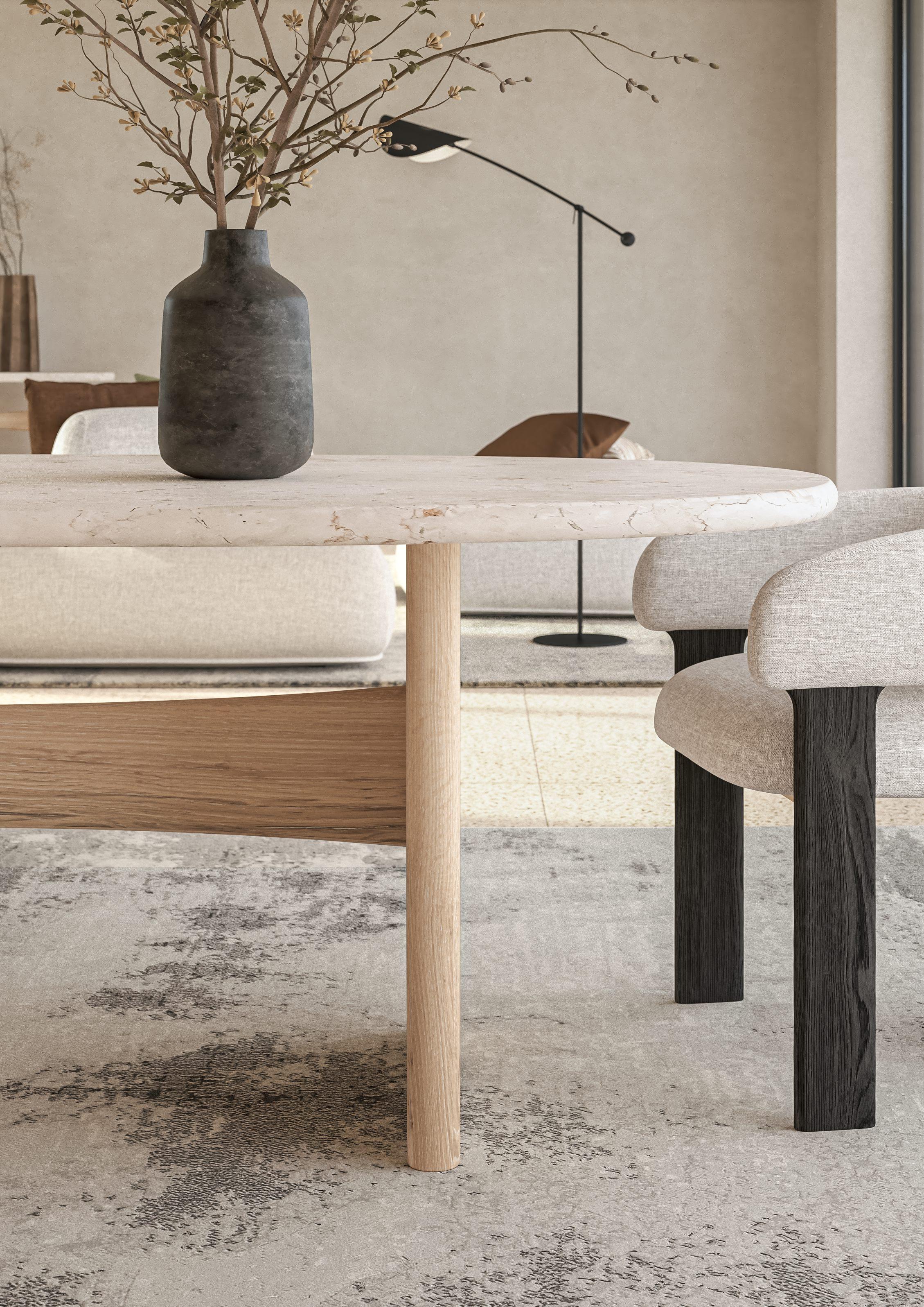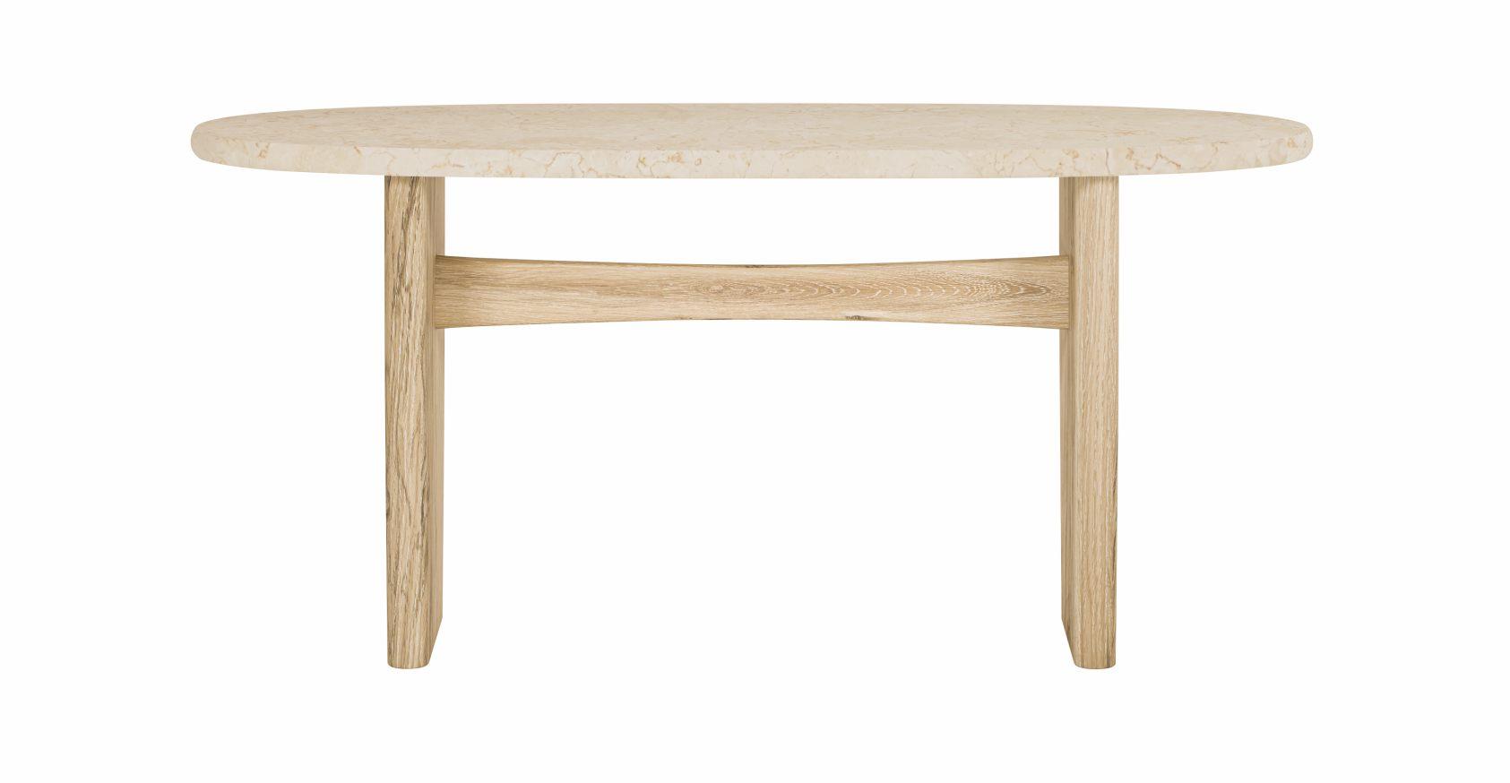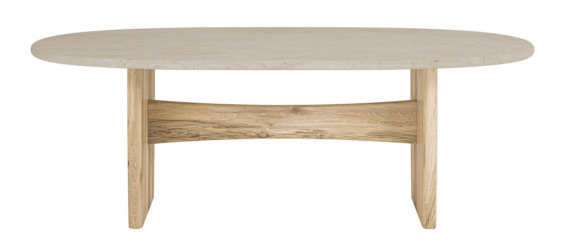 The Isabella Oval Coffee Table pairs a locally sourced cream marble top with an old oak wood finish base, embracing a light and airy elegance. A floating stretcher reinforces the legs, ensuring both stability and a refined, understated aesthetic.