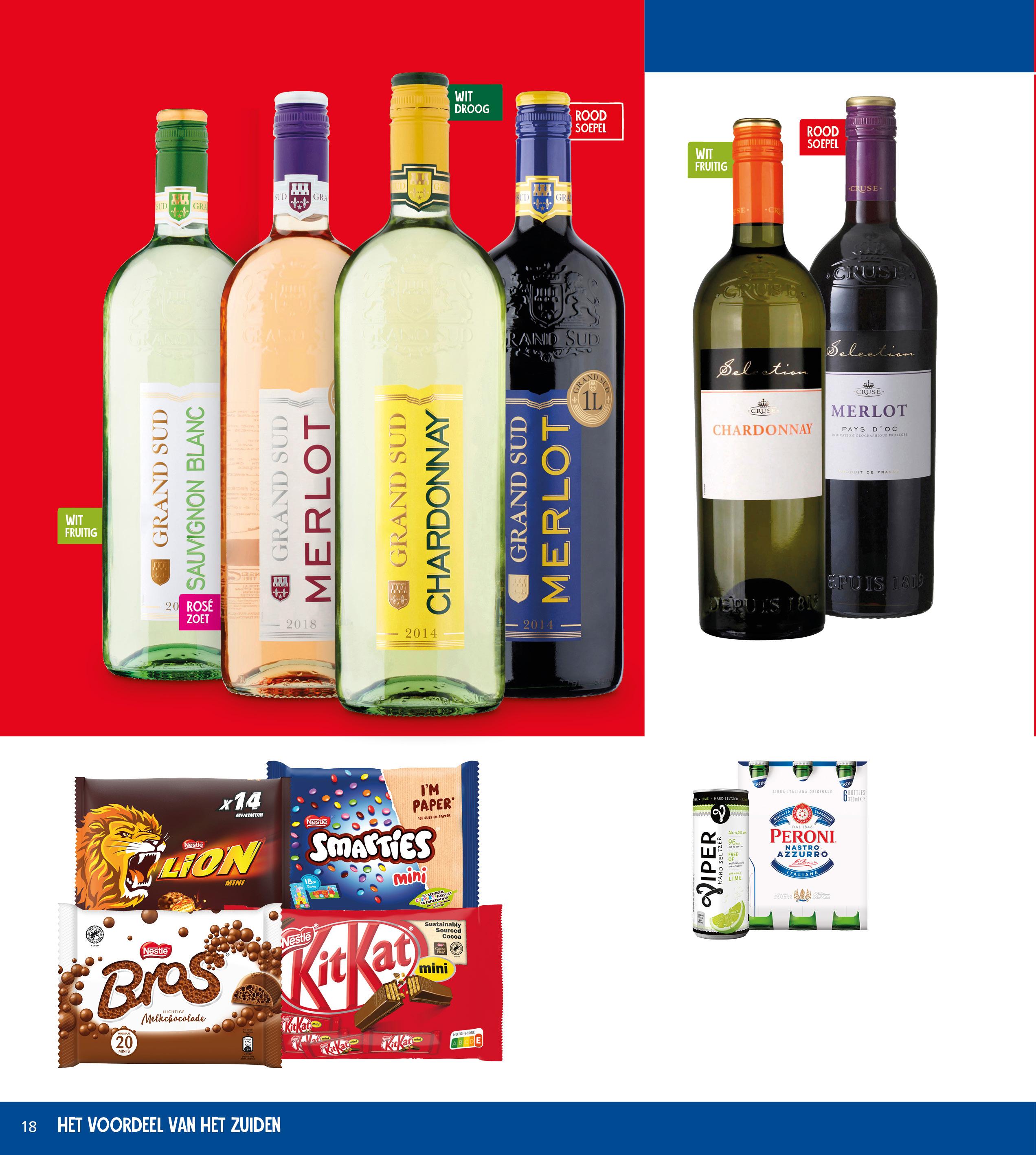 Grand Sud alle varianten 2x fles 1000 ml 11,38 2 voor 8,99 2 voor 7,99 Cruse selection Chardonnay of Merlot 2x fles 750 ml 9,98 2 voor 4,00 KitKat, Bros, Lion of Smarties mini’s alle varianten 2x zak 208-284 gram 4,90 - 5,90 korting 25% Peroni of Viper alle varianten blik 33 cl, tray 4x 33 cl of 6x 30/33 cl 0,88 - 7,49 0,66 -5,62