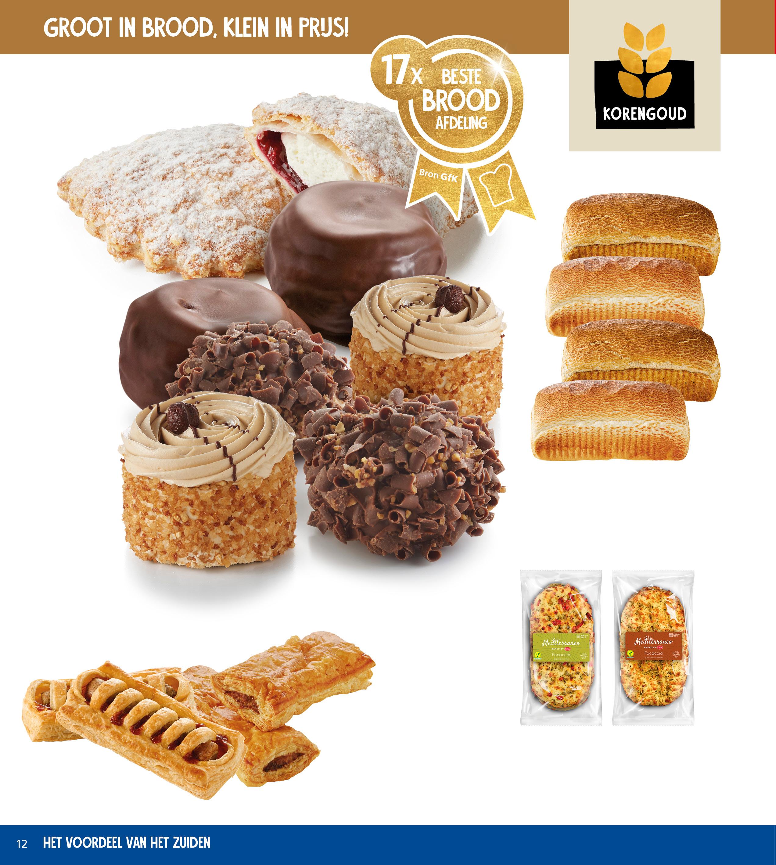 Korengoud stuksgebak: • Bossche bollen • Kersenflappen met slagroom • Hazelnoot crème bollen • Hazelino’s pak 2 stuks 3,4 9 - 3,99 2,99 Korengoud boerenbrood tijger wit of bruin per stuk 2,39 1,99 2 voor 1,50 Korengoud frikandelof saucijzenbroodjes 2 stuks 2,18 2 voor 3,00 Mediterraneo focaccia’s alle varianten 2x pak 150-165 gram 4,98 - 5,18