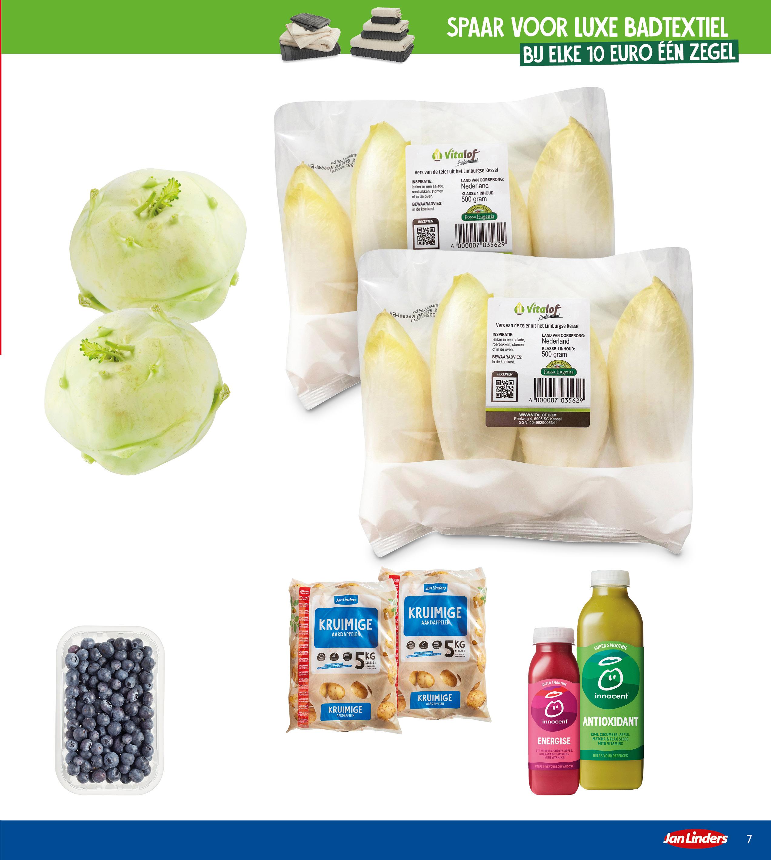 Witlof zak 500 gram 1,99 1,49 Prijs per kilo 2,98 3,49 Prijs per kilo 11,63 Blauwe bessen bak 300 gram 3,99 2 voor 2,00 Koolrabi 2 stuks 2,90 4,49 Prijs per kilo 0,90 Jan Linders kruimige aardappelen zak 5 kilo 5,49 korting 25% Innocent drinks alle varianten fles 300-750 ml 2,65 - 3,85 1,99-2,89