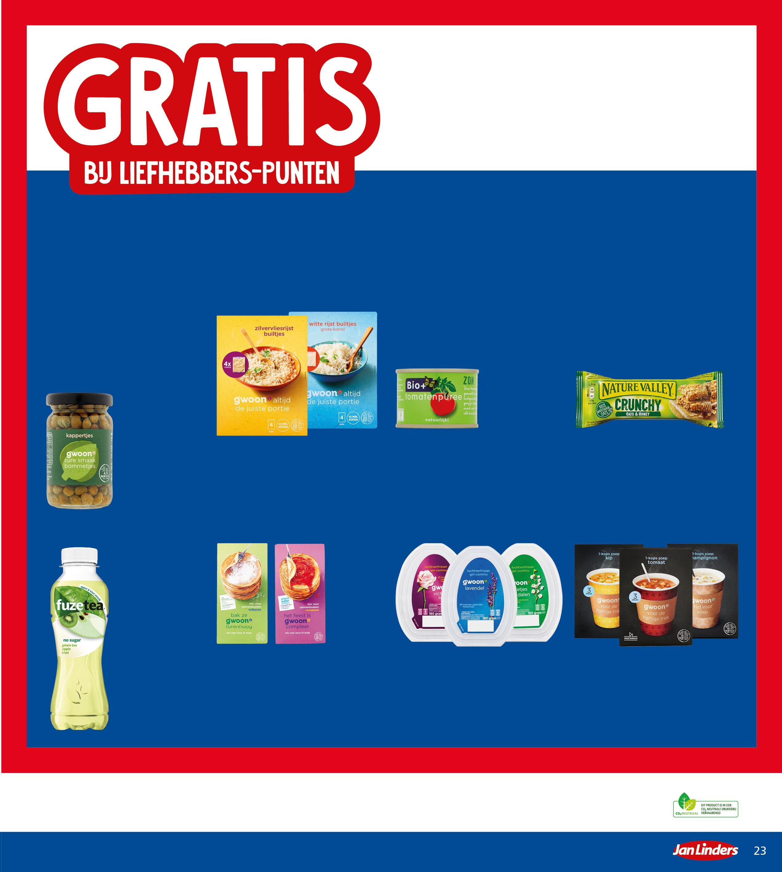 Aanbieding uitverkocht? Vraag gerust een tegoedbon (m.u.v. op=op en producten buiten standaard assortiment). Het aantal eenheden per actie is vastgesteld op max. 12 per klant (particulieren). Voor bieraanbiedingen: max. 6 kratten/trays per klant. Geen alcohol-/tabakverkoop aan personen <18 jaar. Bij een actie geldig bij meerdere stuks, is de actieprijs alleen van kracht bij het genoemde aantal producten. Bloemen zijn vanaf dinsdag verkrijgbaar en worden niet verkocht in Gennep, Eindhoven, Brunssum en Maastricht De Heeg. Onder voorbehoud van prijswijzigingen/zetfouten. Folder niet ontvangen? Meld dit op janlinders.nl/folderklachten Heb je nog tips of vragen? Ga naar janlinders.nl/klantenservice