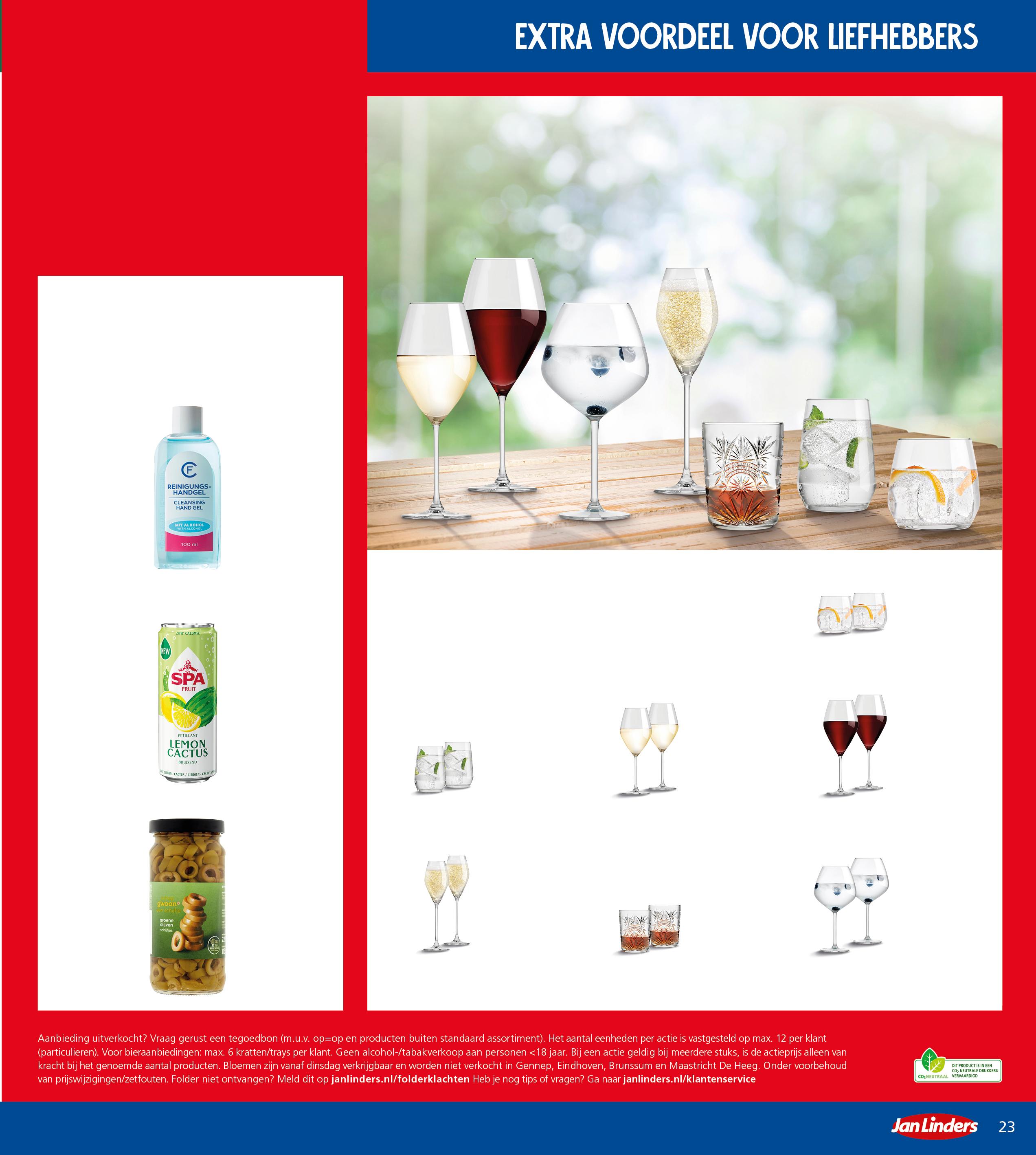 exclusief voor liefhebbers : =tot 80% korting Exclusief bij Jan Linders: Maak je tafel compleet met de luxe Royal Leerdam glazen uit de Vinisse-collectie. Je hebt al een set glazen vanaf 1,99 bij inlevering van 125 Liefhebbers-punten. Ga voor meer informatie naar janlinders.nl/glazen bij 125 punten =80% korting 1,99 Waterglazen set van 2, 37 cl 9,99 bij 125 punten =73% korting 3,99 Rode wijnglazen set van 2, 59 cl 14,99 bij 125 punten =80% korting 3,99 Gin-Tonic glazen set van 2, 75 cl 19,99 bij 125 punten =73% korting 3,99 Champagne glazen set van 2, 20 cl 14,99 bij 125 punten =70% korting 2,99 Longdrink glazen set van 2, 45 cl 9,99 bij 125 punten =80% korting 3,99 Cocktail glazen set van 2, 35 cl 19,99 bij 125 punten =73% korting 3,99 Scan de QR-code of ga naar janlinders.nl/liefhebbers g’woon olijven schijfjes* groen of zwart pot 230 gram 0,89 - 1,14 Spa Fruit sparkling Lemon Cactus** blik 250 ml 0,69 bij 50 punten =100% korting 0,00 bij 225 punten =100% korting 0,00 bij 75 punten =100% korting 0,00 Handgel desinfectie* fles 100 ml 2,99 Maximaal 1 product gratis per actie per Liefhebbers-pas * Acties geldig t/m zondag 16 april 2023. ** Actie geldig t/m zondag 23 april 2023. Witte wijnglazen set van 2, 47 cl 14,99