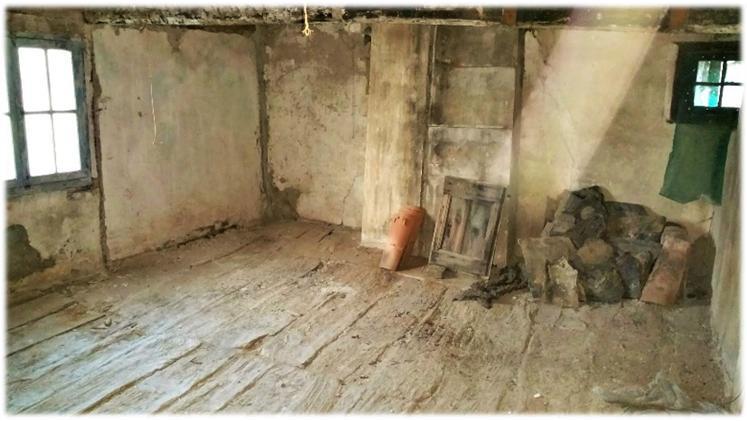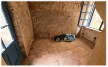 Sovrummet på bottenvåningen har varsamt renoverats. Golvet lagt med samma typ av tomettes som i köket och väggarna kommer att täckas med en varm gul sandtonad puts även här, med synliga murstenar på sina ställen som ger känslan av väggarnas bastanta konstruktion.