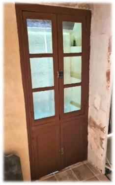 Fönstret från 1950-talet och en dörr från 1920-talet som öppnar sig mot gården, har varsamt restaurerats och vittnar om husets olika omvandlingsperioder. Taket har nya synliga bjälkar som kommer att målas i en ekbrun nyans av äggoljetempera, vilket förstärker rummets varma och autentiska atmosfär.