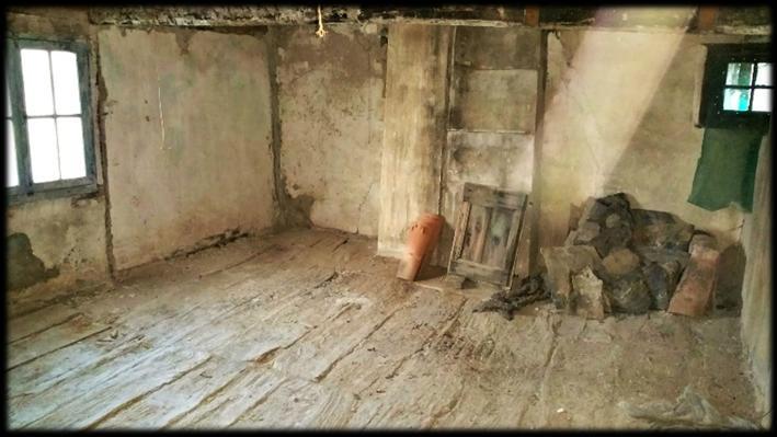 Une fenêtre des années 1950 et une porte donnant sur la cour, datant des années 1920, ont été restaurées avec attention, témoignant des différentes époques de transformation de la maison. Le plafond présente de nouvelles poutres apparentes qui seront peintes à l'huile dans une teinte brun chêne,renforçant l’atmosphère chaleureuse et authentique de la pièce.