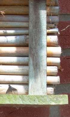 De muurrouwzwever parasiteert op solitaire bijen, met name metselbijen, en zo kwam hij in m’n tuin terecht. Ik inspecteerde mijn nietige bijenhotelletje dat ik ooit bij het biodiversiteitspakket van de gemeente Woudrichem had ontvangen, en warempel daar zat er nog een tweede exemplaar, waarschijnlijk net uit de pop gekropen. Een veel voorkomende soort in bijenhotels is de Rosse metselbij die een rijtje kamertjes maakt in bijvoorbeeld een bamboestengel. In ieder kamertje legt hij een ei met een stuifmeelvoorraad.