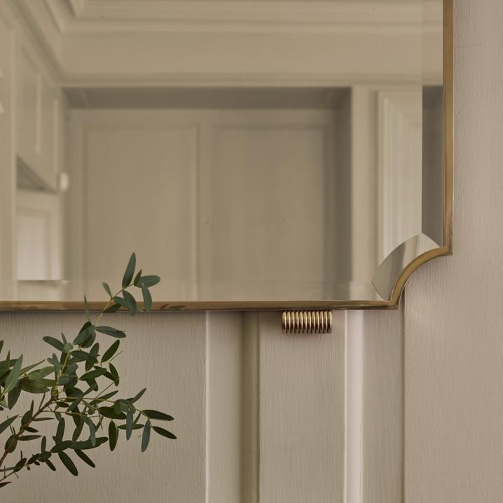 The distinctive emblem shape of this is based on a mid-century Italian design. The brass frame is embellished with formed beaded detailing. Available in a brass or bronze finish.