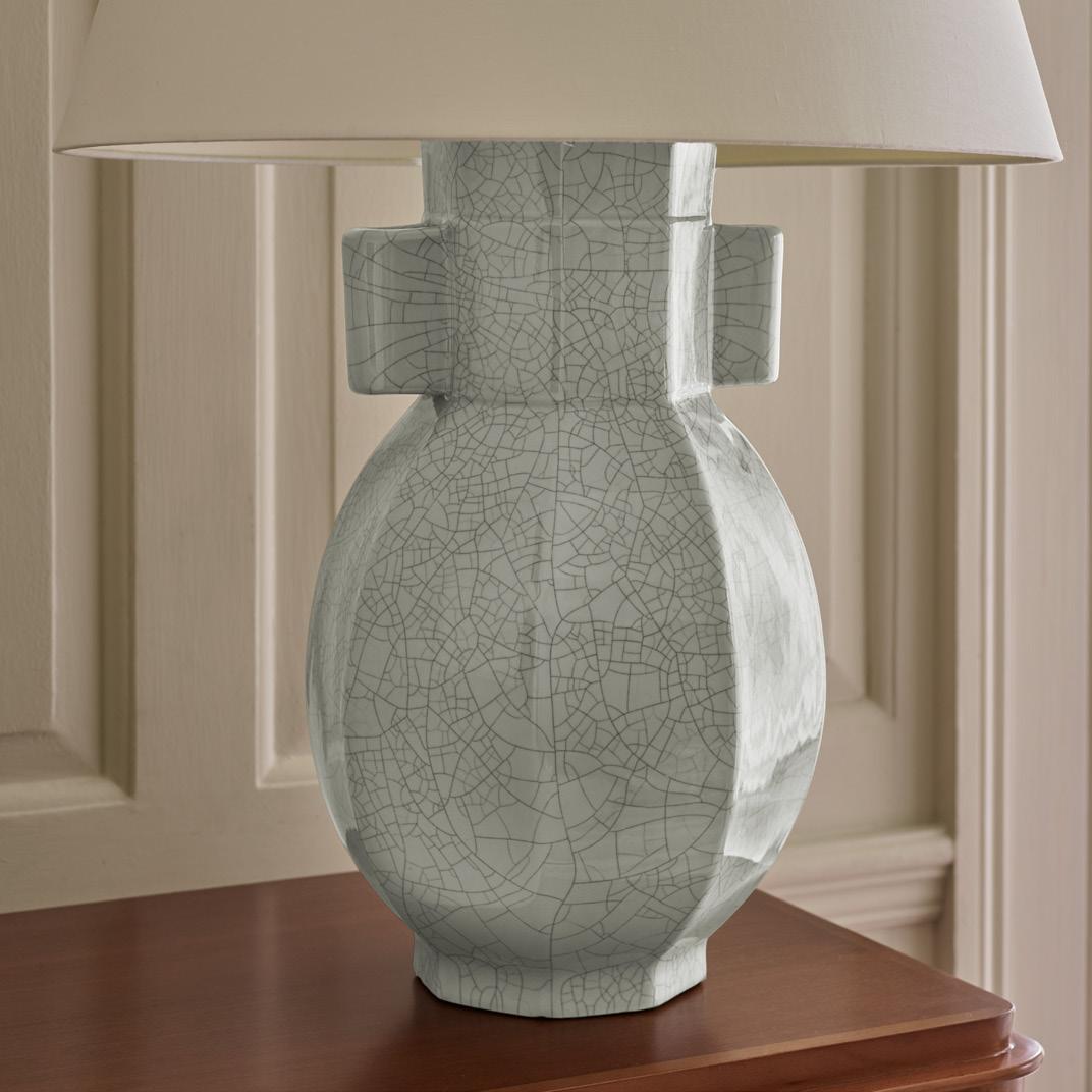 Based on an original antique Longquan ceramic vase, this lamp is slip cast in earthenware. The octagonal faceted baluster is decorated in a delicate celadon crackle glaze.