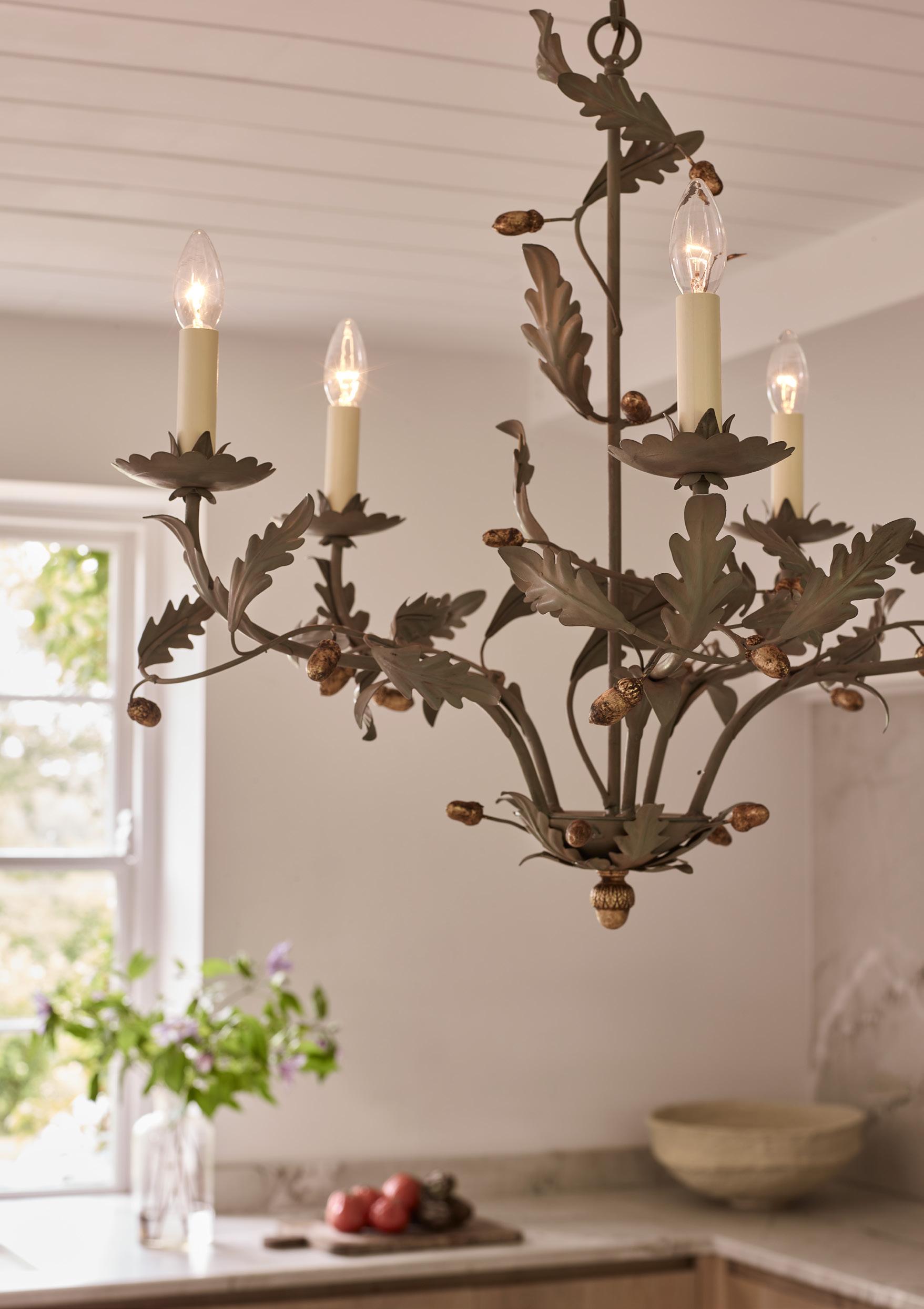 Inspired by an ornate original 1970s Italian chandelier, this design features distressed green painted oak leaves and gilded acorn details.