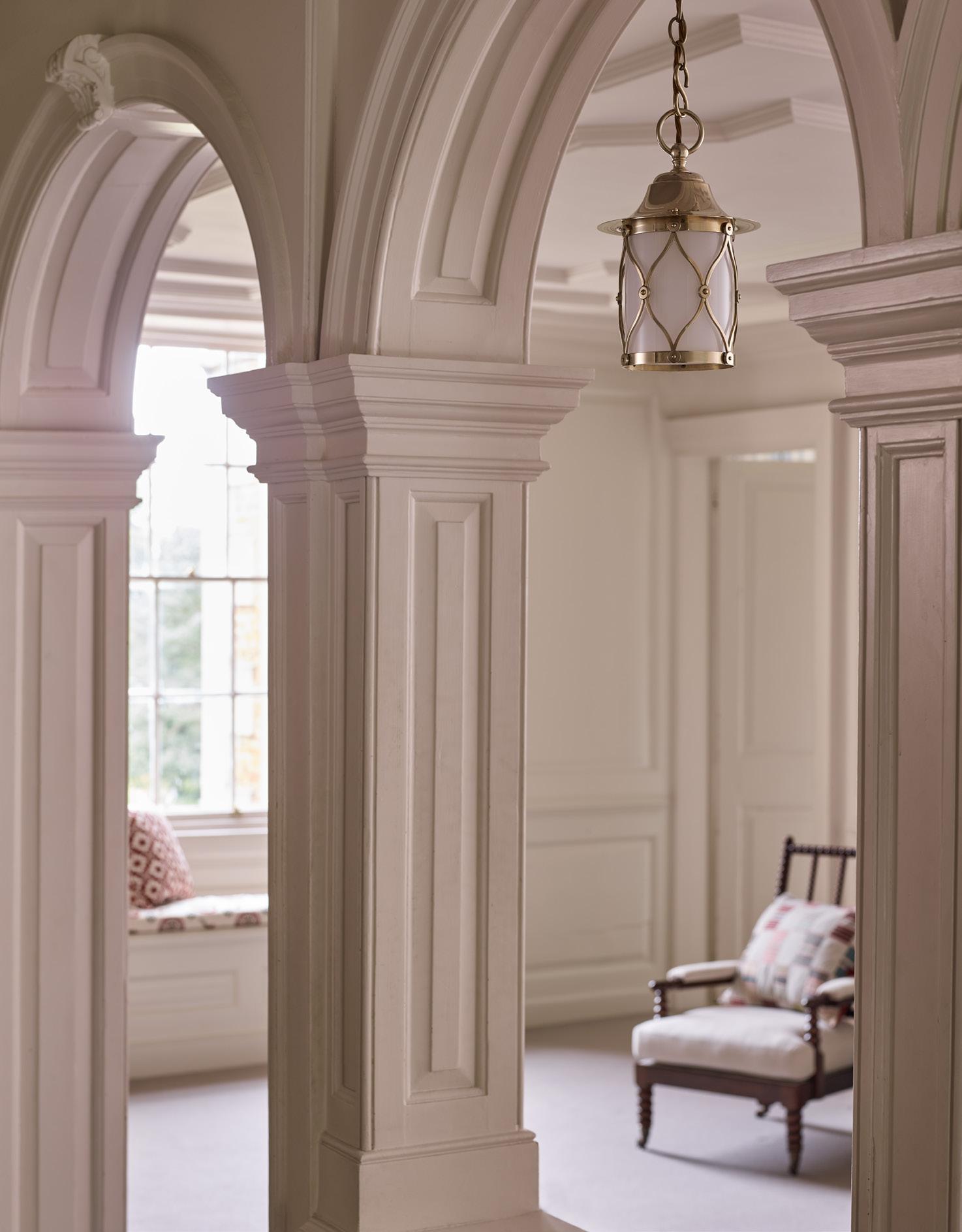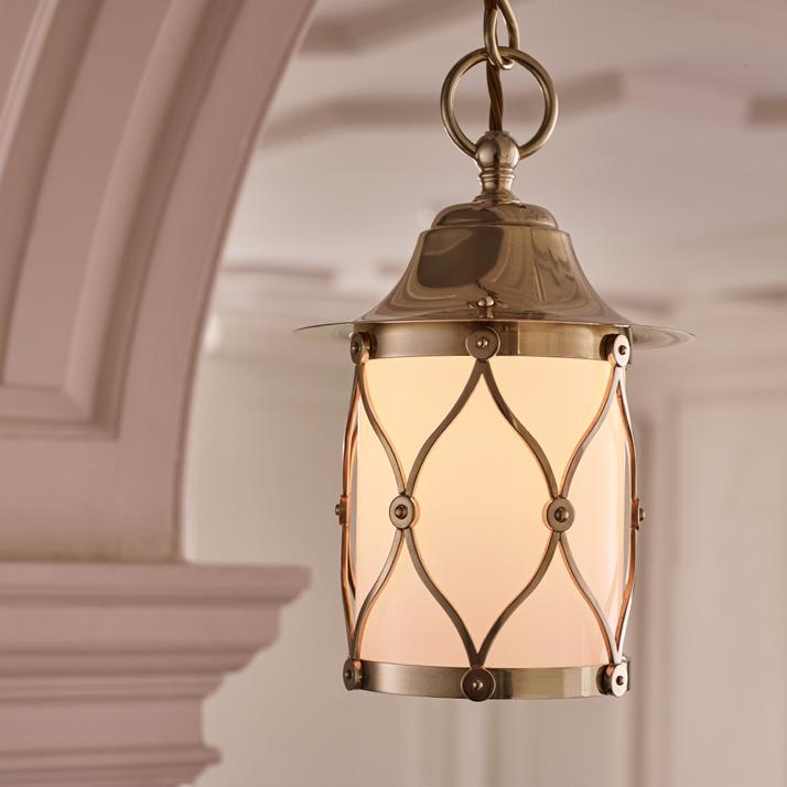 Inspired by an early 20th Century Arts and Crafts design, this lantern has been produced with small spaces in mind. The brass lattice frame surrounds an opaline glass cylinder shade, giving a soft and distinctive light effect.