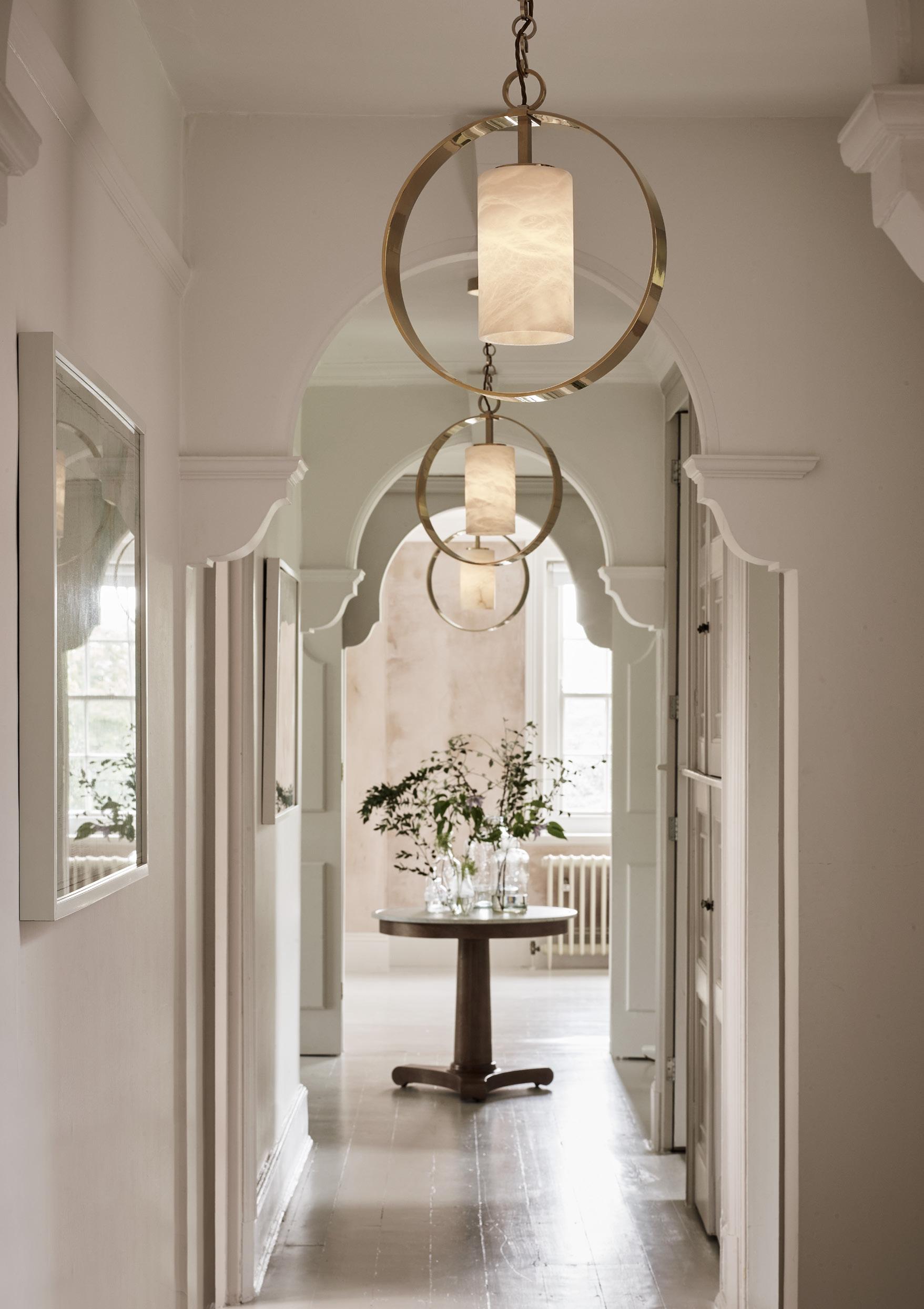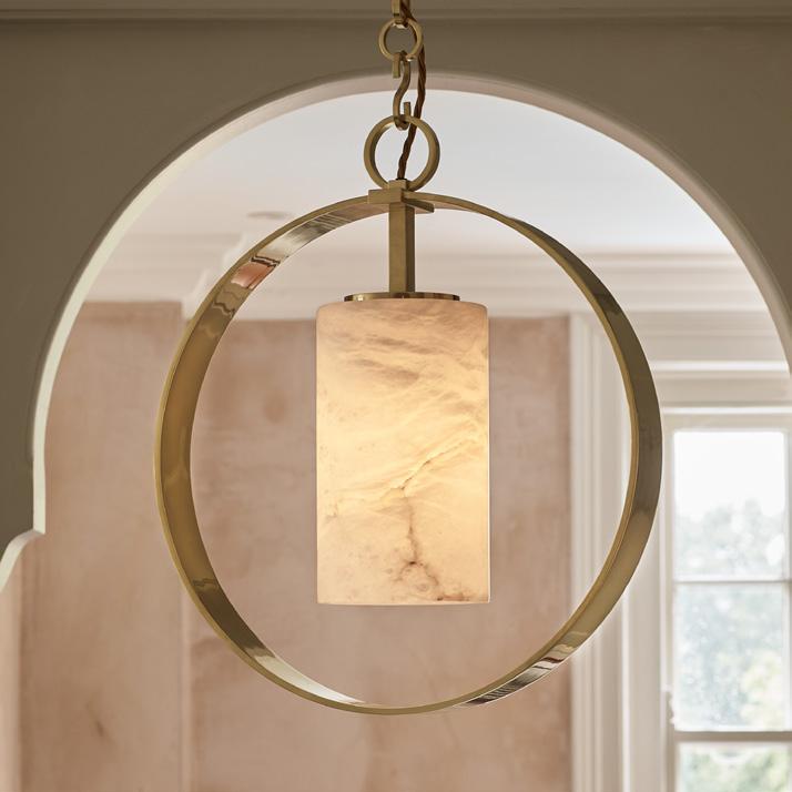The halo of the highly polished, solid cast brass ring surrounds a hand finished alabaster shade which produces a beautiful, warm light. The fitting can be modified to hang multiple lights together for a more dramatic result. Available in polished brass or bronze.