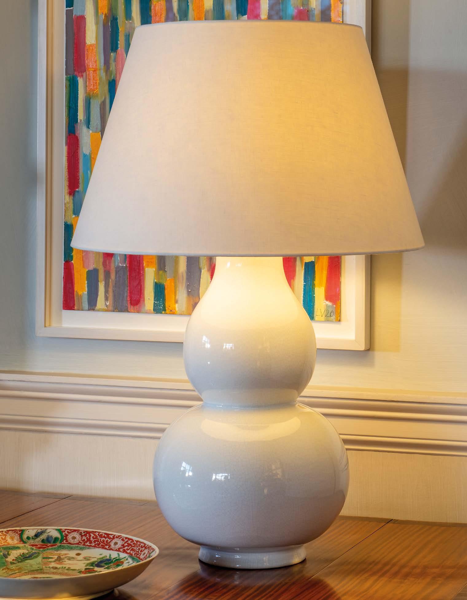 This table lamp is defined by its delicate gourd-shaped body in slip cast ceramic. The Avebury Table Lamp is produced in hand crafted earthenware with a translucent white crackle glaze. Also available in a range of colours.