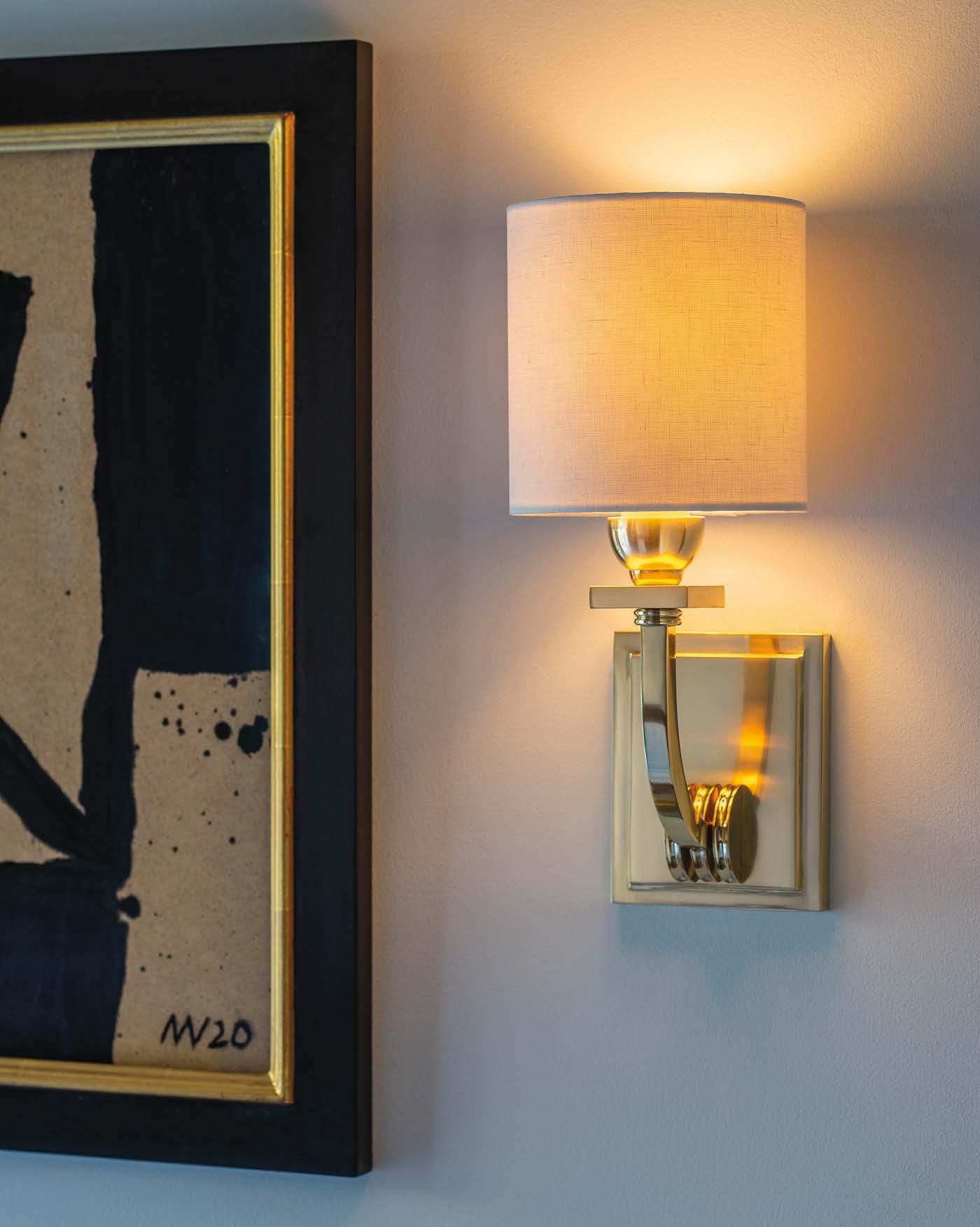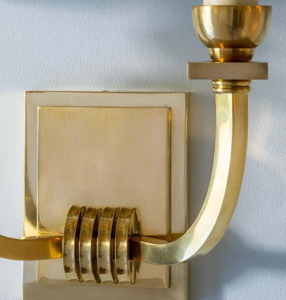 Inspired by the 1940s golden age of glamour, this wall light is modern in style. The arm gracefully meets the backplate and complement the decorative candle cups and distinctive square bocheche detailing. Available in brass and nickel finishes and with 1 or 2 arms.