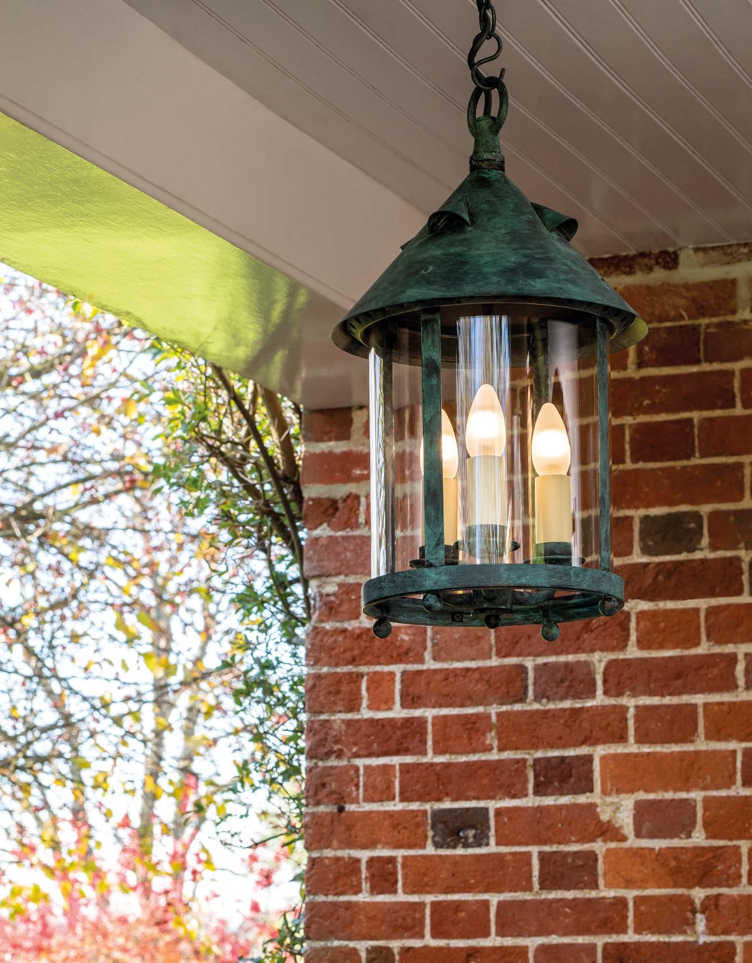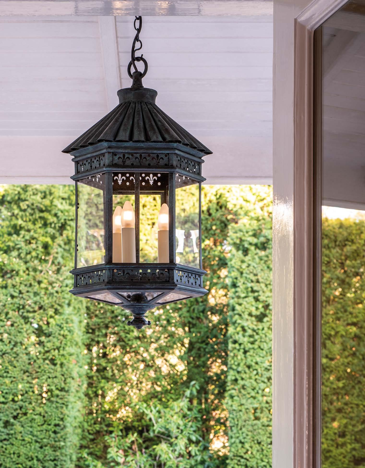 Inspired by a 19th century antique, this lantern takes its inspiration from country/naive folk art. Suitable for outdoor use, this lantern has a verdigris finish. IP44 rated for external use. Also available in a copper bronze finish.