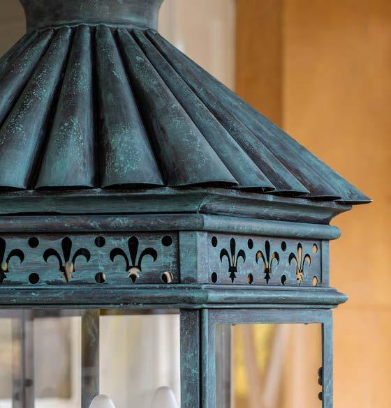 Based on an antique lantern, this design has intricate fretwork detail and a tapering fluted roof. The verdigris finish adds to the elegance of the lantern. IP44 rated for external use. Also available in a copper bronze finish.