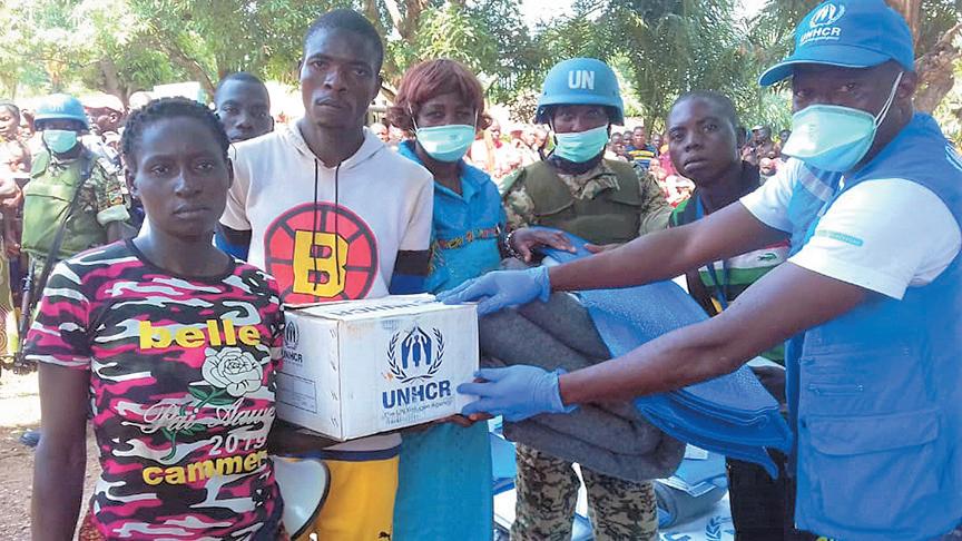 中央アフリカ共和国とコンゴ民主共和国 との国境沿いで、同国から逃れてきた難 民に援助キットを配布