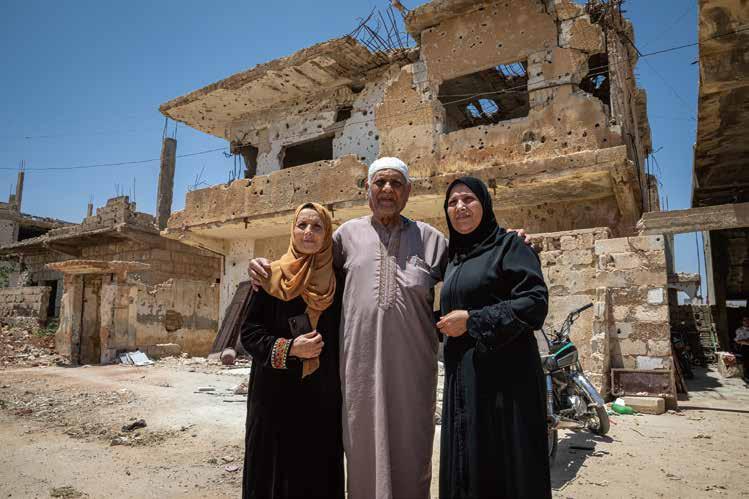のは、変わり果てた姿の我が家でした。壁が 崩れていたうえに窓やドアもなくなっていた ので、すぐに修理をしなければならなかった といいます。破損した家の様子を語る厳しい表情の一方で、自然と顔がほころぶのが、故郷 への思いを口にするときです。「破壊されつくした状況にもかかわらず、私たちはこの国、 そして自分たちのコミュニティを愛していま す。それは環境であり、隣人たちです。この 国のこうした美しいものが、故郷というもの のような気がするのです。だから私たちはこ こにいるのです」。