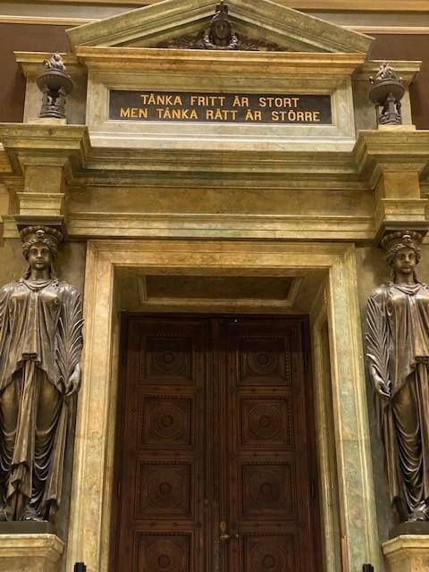 講堂の入口ドアの上に金文字で書かれている「自由に考えることは偉大だが、正しく考えることはそ れ以上に偉大である」 (Tänkafrittärstortmentänkarättärstörre) は、18世紀にウプサラ大学で学ん だ思想家ThomasThorildの格言です。「自由に考えること」はいつでもどこでもできますが、「正しく考 えること」は生きている時代や取り巻く環境で変化するもの。Thorildの言う「正しく」は「論理的に」とい う意味なのでしょう。この格言を知ったのは、私がウプサラを初めて訪れた1983年のことですが、当 時、法学生であった私の心に今も刻まれています。