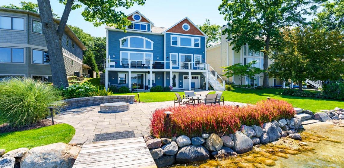 Main level bedroom with ensuite features double-sink quartz vanity and tile shower. Upper level bedrooms include primary suite with vaulted ceiling and magnificent lake views! Bedrooms