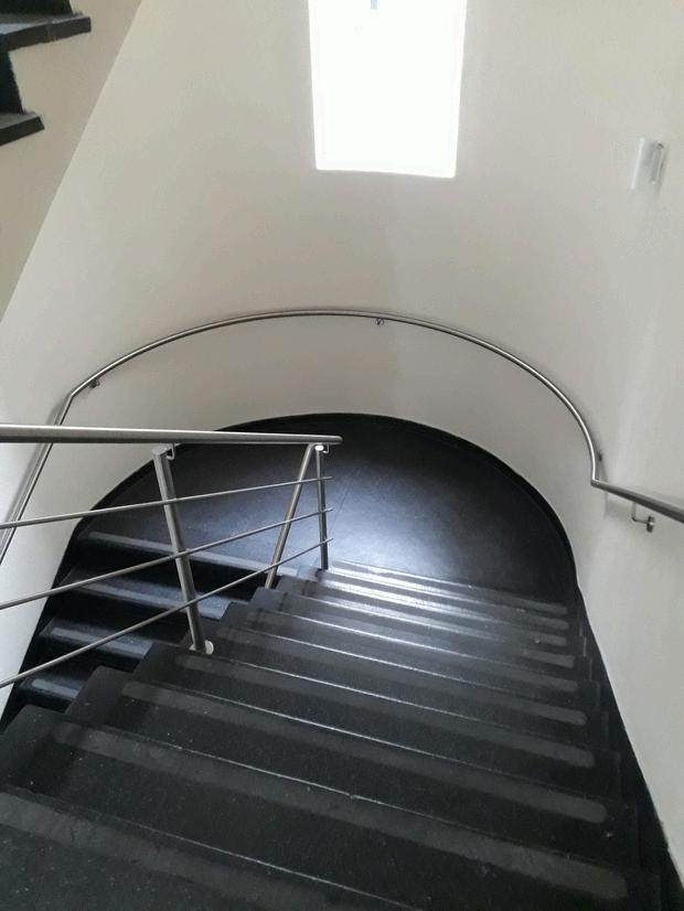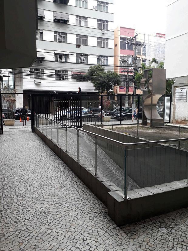 Quando da elaboração do projeto, fomos alertados de que o corrimão existente na escada estava fora do padrão da norma regulamentar, bem como sobre a ausência de corrimão do lado oposto, evidenciando um risco. A Administração se antecipou e instalou novos corrimãos para atender a legislação. Também foram substituídos os guarda-corpos na passagem externa de acesso à portaria pela Lopes Trovão