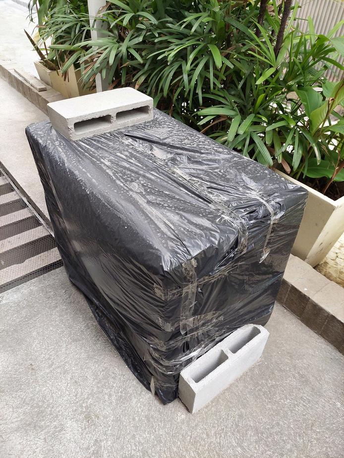 A caixa externa apresentava vazamento há muitos anos, com água da drenagem do solo escorrendo para dentro da parede da garagem.