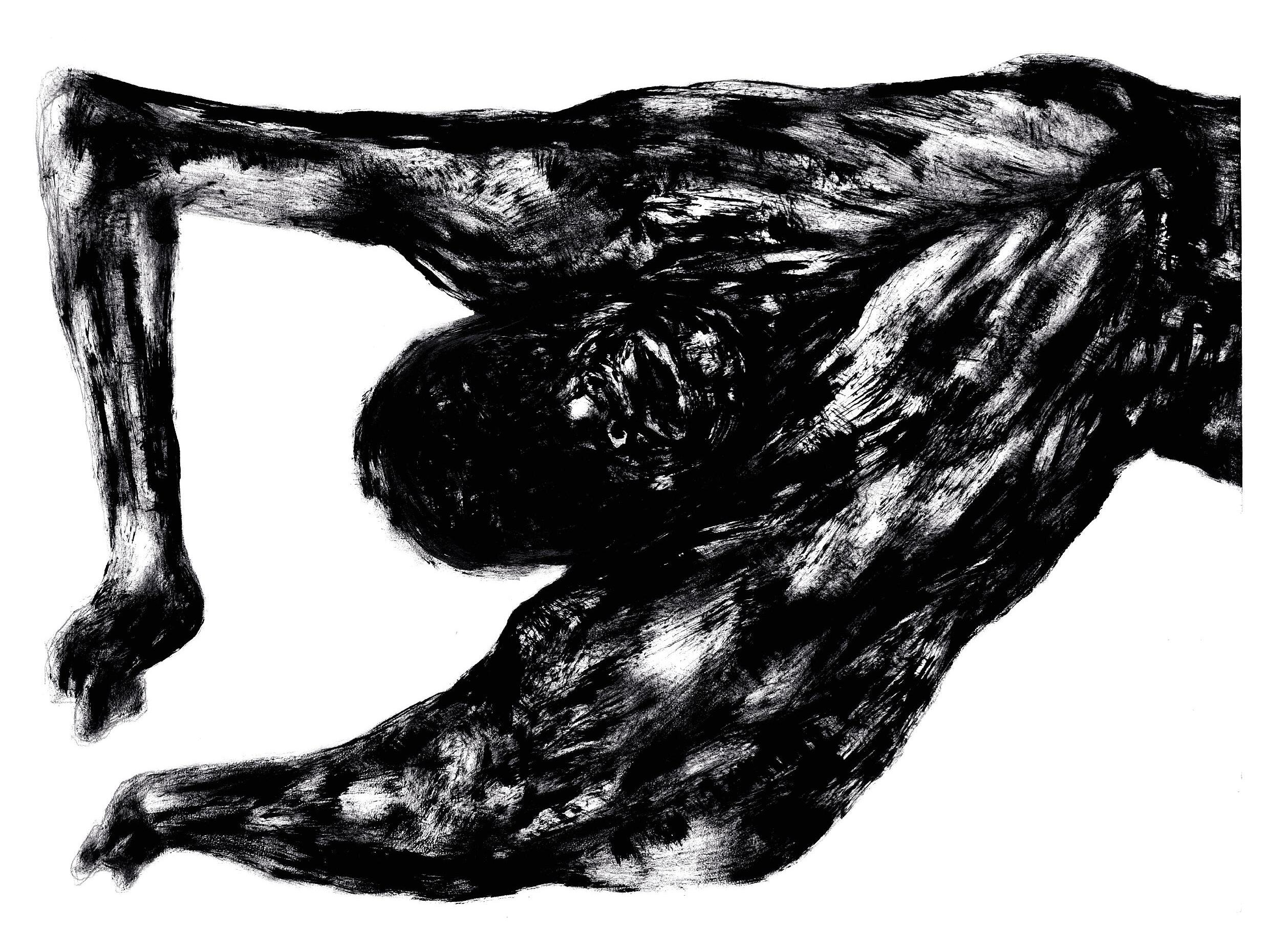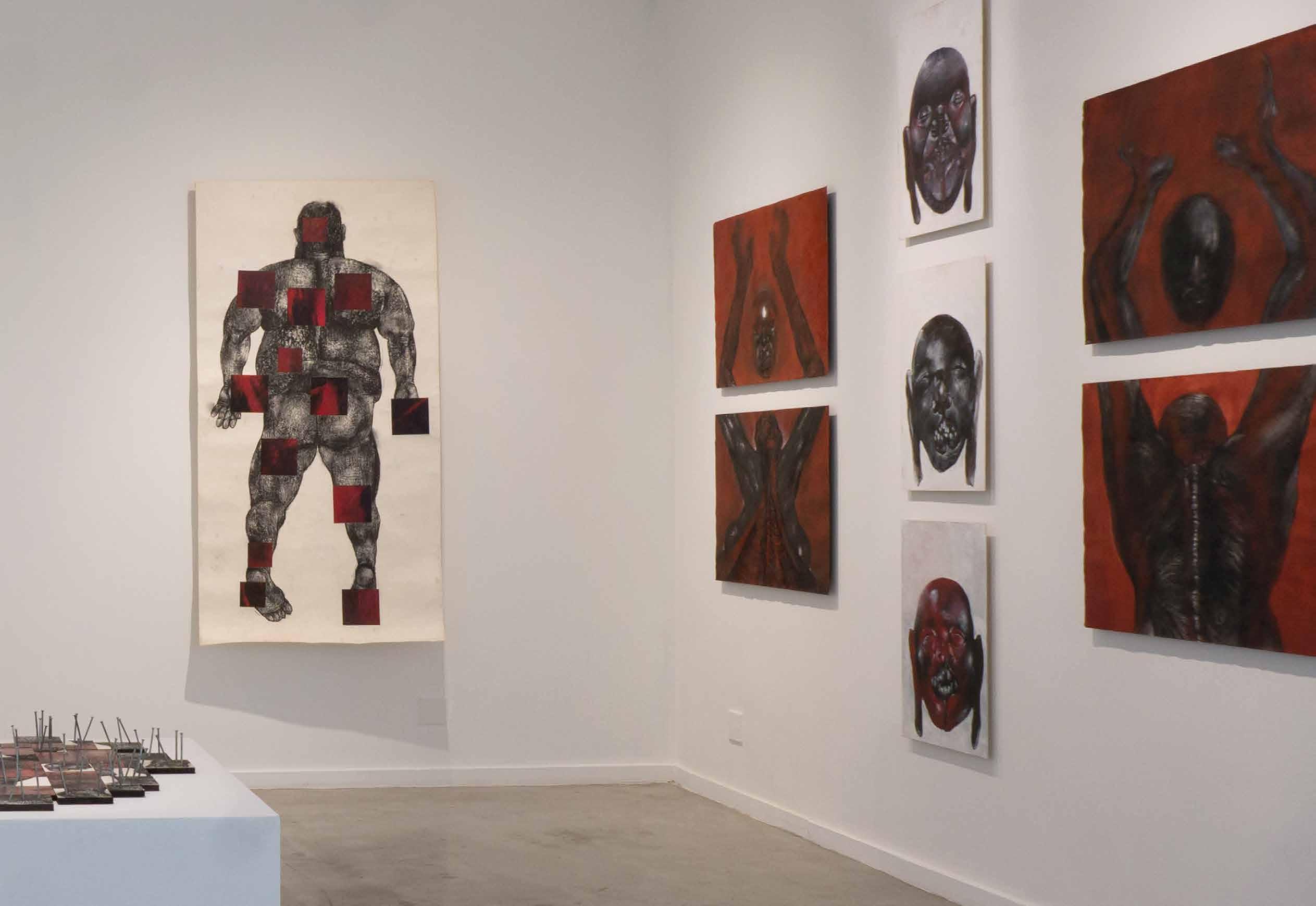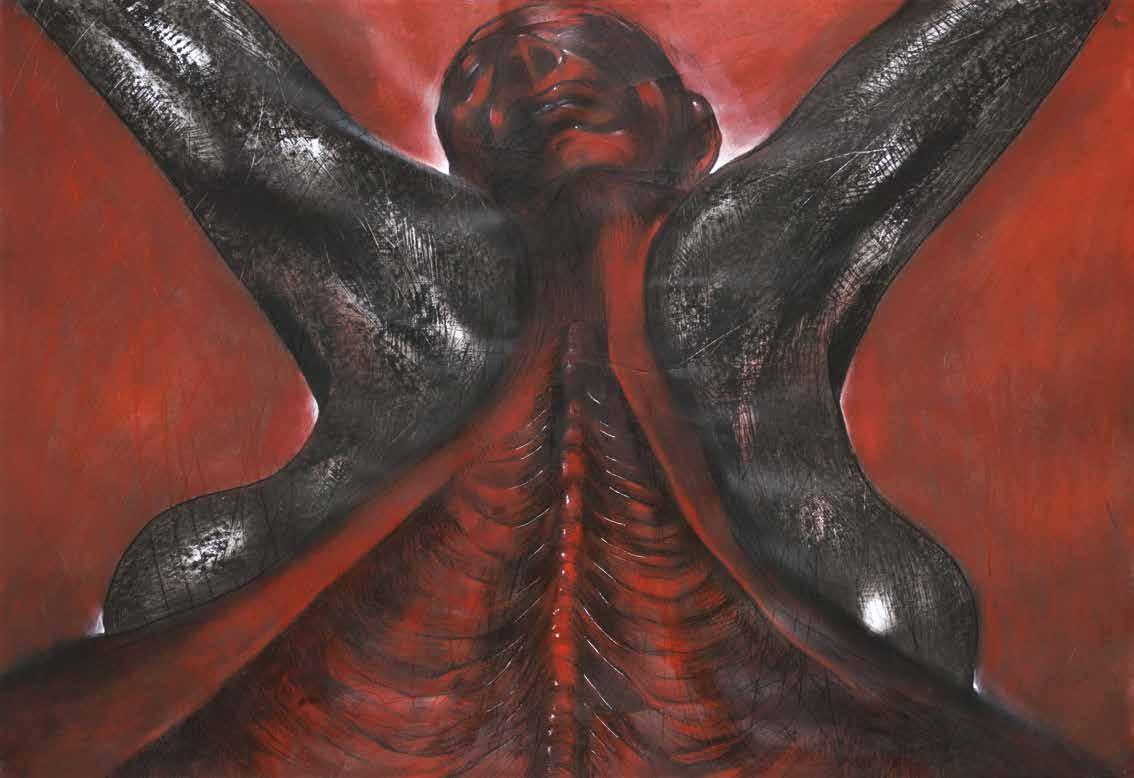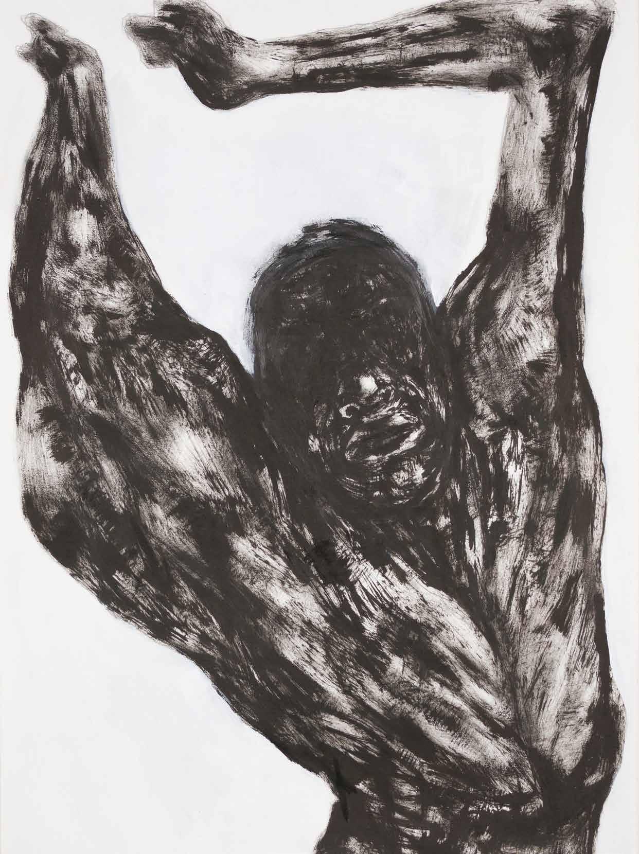 Anti-anatomy is how the artist characterizes his poetical-political proposal of drawing black antibodies, twisted and dismembered, with the intention of promoting a critical reflection over racial issues: “We need to destroy all the logic that defines the classical ‘anatomy lesson’ as a measure of the world, to make space for a dissection which allows the meaning of local ethnic-racial struggles to overflow”: “Anti-anatomy is the racial counterpoint to the officialization of whiteness as a norm”. In his drawings’ anti-anatomy, bodies open fissures which expose their entrails, showing their muscles, nerves, bones, blood, to make visible the spirit of their black ancestrality.