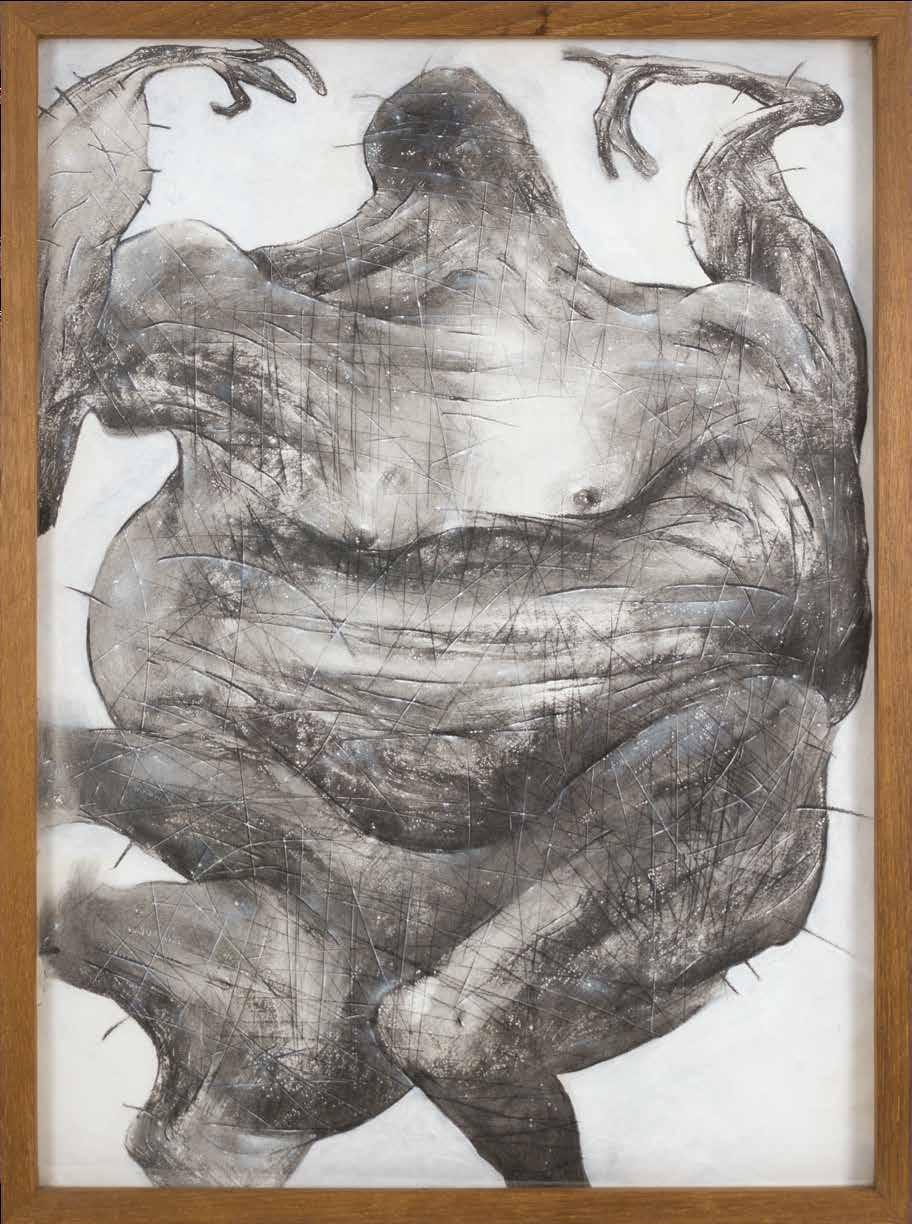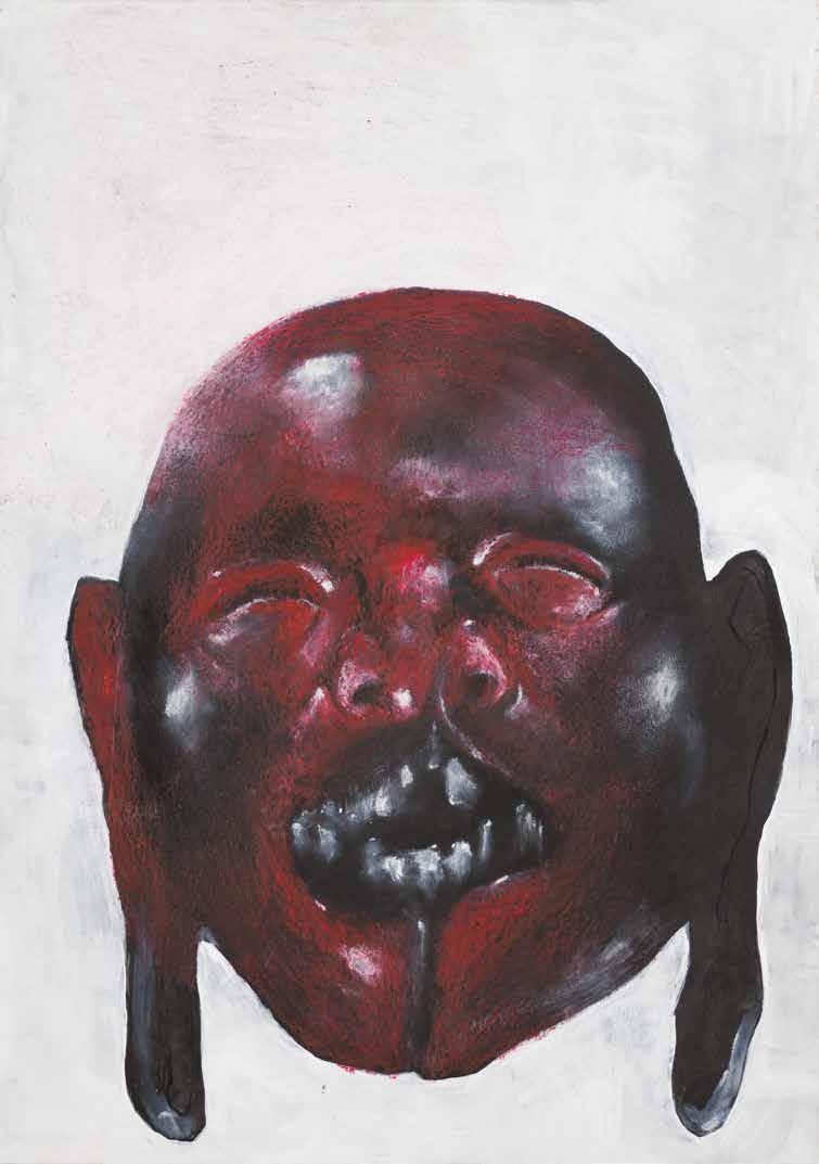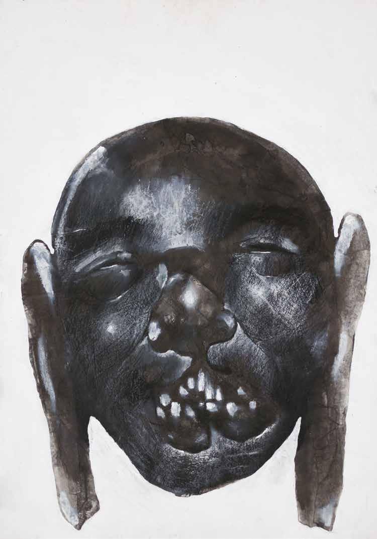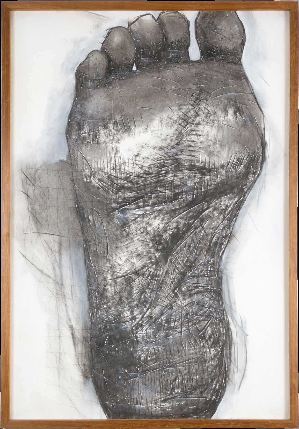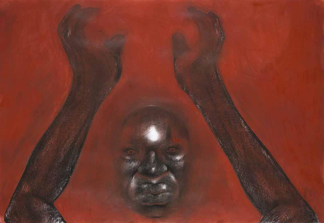 LUCIANO FEIJÃO is an image artisan. A student of drawing and expert in diverse techniques, he works as a master of his craft, who, in a patient and thoughtful way, composes his images with acuteness, utilizing the most various means and resources in which he excels: graffiti, charcoal, nankin, pigments, rubber; brush, pencil, toothbrush, steel wool, razor blades. The composition of his drawings has an high formal strictness. His images are constructed from the parts towards the whole, with the reproduction of elements of different photographs, combined through his imagination, configuring “realistically” unusual figures, distorting reality to show its reverse, its entrails, its strangeness. This twist reflects the political meaning of his work, his struggle against eugenic projects of white supremacy, and his favoring of a black Brazilian identity: “The struggle of the black population will always be twisted, dismembered and anti-anatomical”.