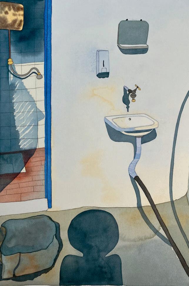 Åsa LowdenKästel, måleri (akvarell). Se bilder ovan: ”Motivet är ett minne från Kreta i byn Lendas, där jag varit många gånger. Husen var enkla och kök och badrum placerades ofta utomhus.