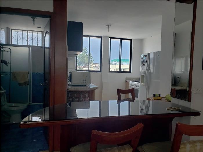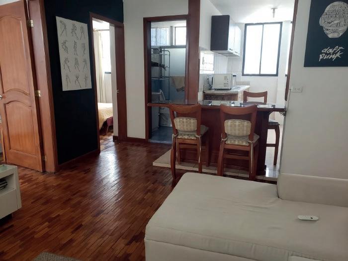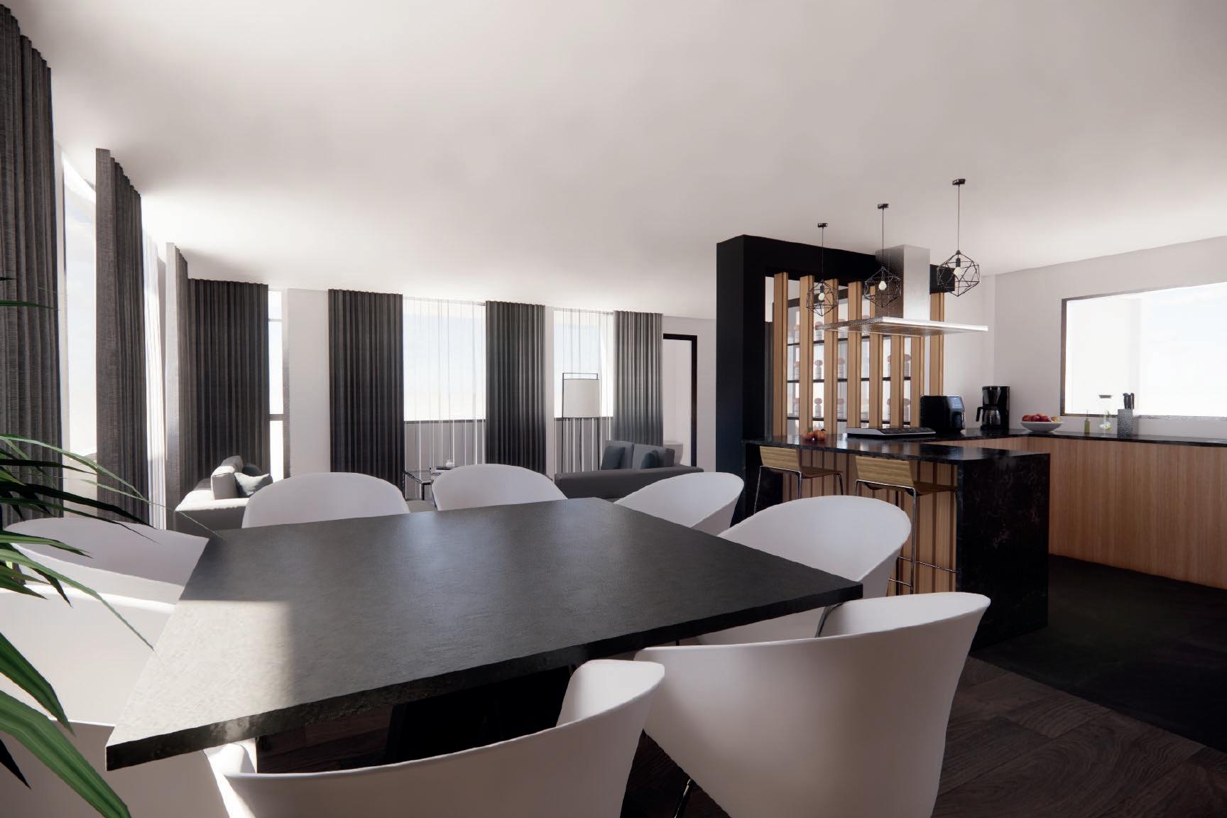 El espacio principal posee un solo ambiente, donde se conjuga la cocina con el área social. Para llegar a los baños y las habitaciones se transita mediante un pasillo que actua como elemento de transición y separación.
