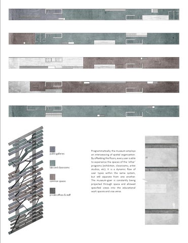 Programmatically, the museum employs an interweaving of spatial organization. By offsetting the floors, every user is able to experience the spaces of the ‘other’ programs (exhibition, classrooms, artist studios, etc). It is a dynamic flow of user types within the same system, but still separate from one another. The museum-goer is constantly being projected through space and allowed specified views into the educational work spaces and visa versa.