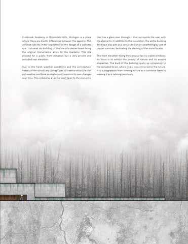 Cranbrook Academy in Bloomfield Hills, Michigan is a place where there are drastic differences between the seasons. This variance was my initial inspiration for the design of a wellness spa. I situated my building on the line of a dense forest facing the original monumental entry to the Academy. This site allowed for a public front elevation but a very private and secluded rear elevation. Due to the harsh weather conditions and the architectural history of the school, my concept was to create a structure that put weather and time on display and monitors its own changes over time. This is done by a central void, open to the elements,