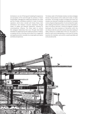 Architecture is an art of framing and mediating the experience and perception of the world through the activation of latent morphologies. Managing the relationship between the visible and the invisible, architecture performs a level of narrative operations, which share a border with literary theory. Both architecture and literature structure experience through means of spatial and temporal expressions, allowing for cross-disciplinary influence. This thesis seeks to uncover the analogical relationships that occur through inter-medial translation by exploring how the creative processes of reading, re-reading, and thus re-writing, which allow for an imaginative and cognitive pluralism, translate into a meaningful and creative architectural experience.