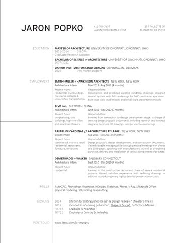 MASTER OF ARCHITECTURE UNIVERSITY OF CINCINNATI, CINCINNATI, OHIO 2011-2014 3.8 GPA Graduate Research Assistant BACHELOR OF SCIENCE IN ARCHITECTURE UNIVERSITY OF CINCINNATI, CINCINNATI, OHIO 2007-2011 DANISH INSTITUTE FOR STUDY ABROAD COPENHAGEN, DENMARK 2010 Two month program
