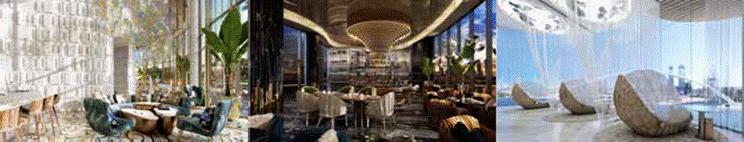 with infinity pools. Meanwhile, podium level amenities include a beautiful lagoon dropoff area, a gym and spa, cigar lounge, club rooms, a floating juice bar and cabanas, lush tropical gardens, and last but not least, a stunning Cavalli-branded lobby.