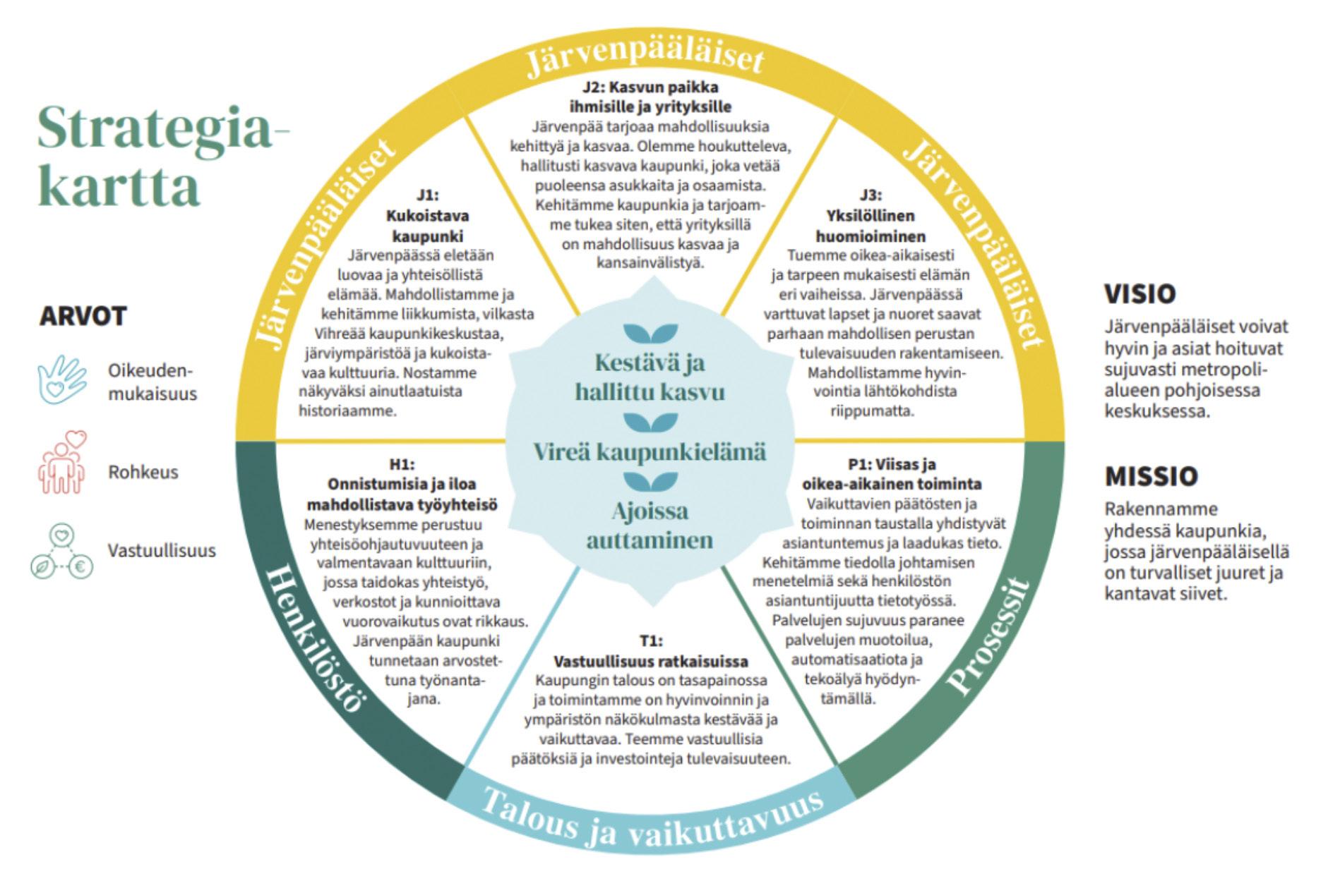 Vuonna 2022 uudistettiin Järvenpään kaupunkistrategia, jonka osana hyväksyttiin myös visio, missio, arvot ja strategiset painopisteet.