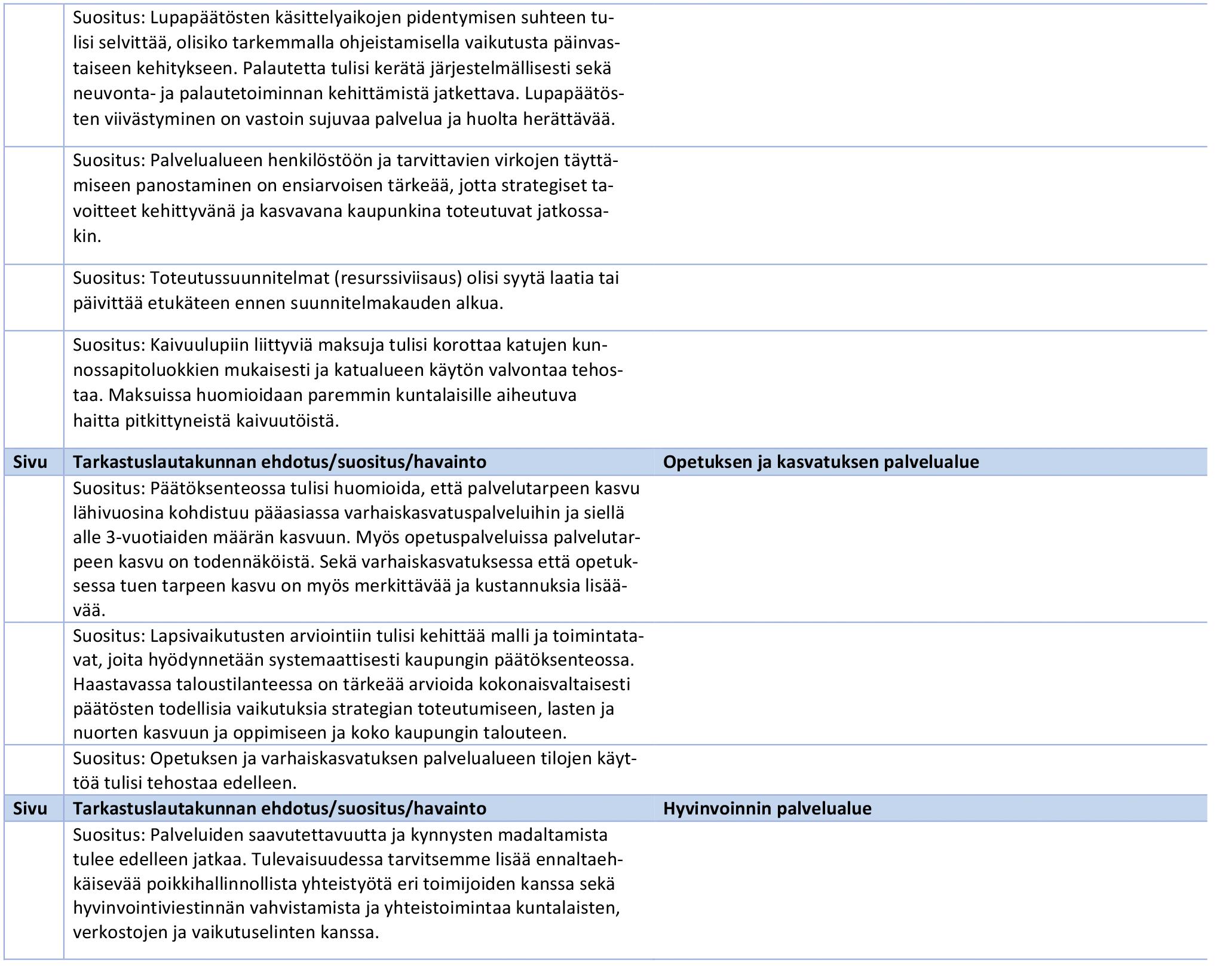 Suositus: Tarkastuslautakunta näkee suurena riskinä mahdolliset talouden sopeuttamisvaatimukset, jotka koskettavat opetuksen ja kasvatuksen palvelualuetta. Tarkastuslautakunta on yhtä lailla huolestunut siitä, ettei lapsia oteta riittävästi huomioon rakenteita ja taloutta tarkastellessa. Toimintaa ja päätöksiä tukemaan tarvitaan lapsivaikutusten arviointia.
