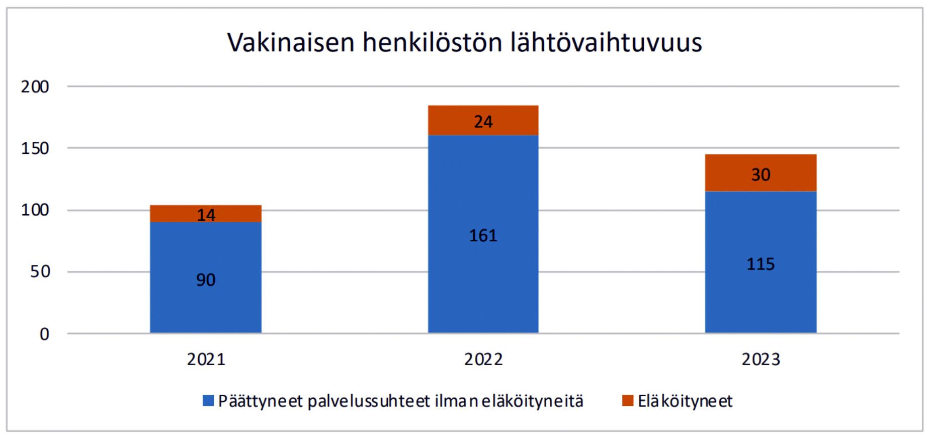 Vuonna 2020 lähtövaihtuvuus (eläkkeet mukaan lukien) oli 14,3 %, 2021 (10,4 %) ja 2022 (18,3 %). 31.12.2022 koulupsykologit ja kuraattorit (25) siirtyivät hyvinvointialueelle. Kun sen vähentää muusta poistumasta 2022, ollaan vuoden 2020 lähteneiden määrän tasolla. Seurantaa jatketaan.