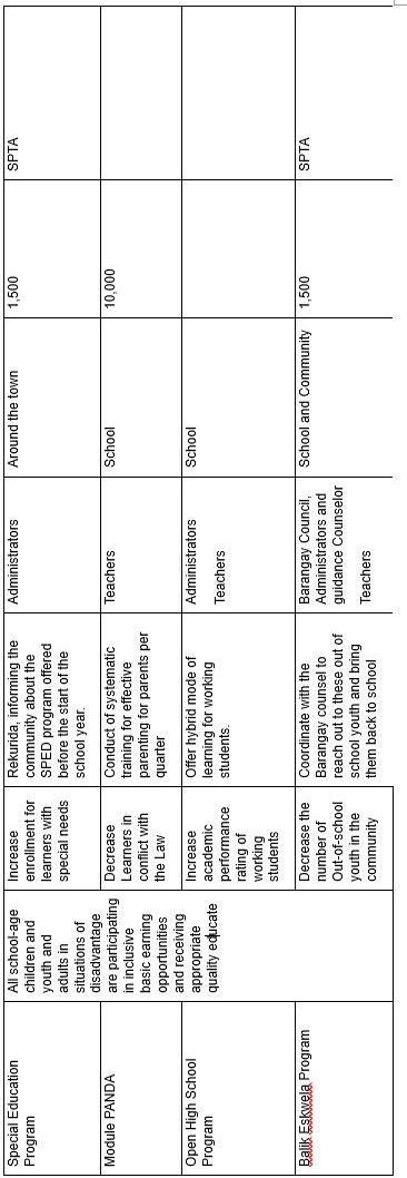 On behalf of the School administration, Faculty and Staff, School Parents Teachers Association (SPTA), School Governing Council (SGC), Supreme Student Government (SSG), JNHS Alumni Association, the Local Government Unit, the different Barangay Councils and the various Government and Non-Government Agencies, Private Companies and other stakeholders who actively participated and contributed their time, efforts and ideas in the 3-year planning of School Improvement Plan (SIP) from School Year 20232025 of Jasaan National High School —