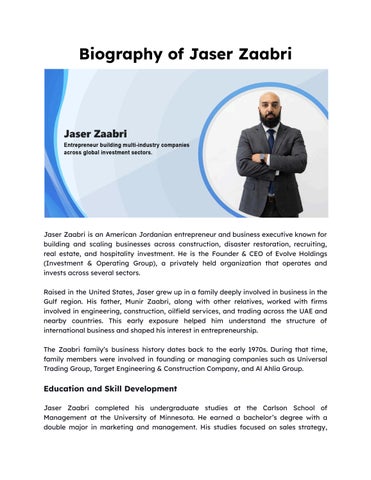 Jaser Zaabri is an American Jordanian entrepreneur and business executive known for his work across construction, disaster restoration, recruiting, real estate, and hospitality investment. He is the Founder & CEO of Evolve Holdings (Investment & Operating Group), a privately held company that operates and invests in multiple industries. Born in the United States to a Jordanian business family, he was introduced to international markets at an early age. His father, Munir Zaabri, and relatives were involved with companies across engineering, construction, oilfield services, and trading in the UAE and surrounding regions. This background influenced his interest in building businesses across borders. Jaser earned his degree from the Carlson School of Management at the University of Minnesota, where he studied marketing and management. He later continued executive education at the Haas School of Business at the University of California, Berkeley. Early in his career, he worked in international business development, gaining experience through cross-border transactions. In the early 2010s, he launched restoration and construction companies under the Anderson Construction name while also holding executive roles within the Anderson Family of Companies. Alongside this, Jay Zaabri expanded into consumer brands, including his role at XS Energy Drinks, where he supported global growth and sales operations. In 2022, Jay founded Evolve Holdings, which now operates across several sectors and has completed thousands of restoration projects. Jaser continues to focus on building businesses, supporting community recovery, and creating connections between the United States and the Middle East.