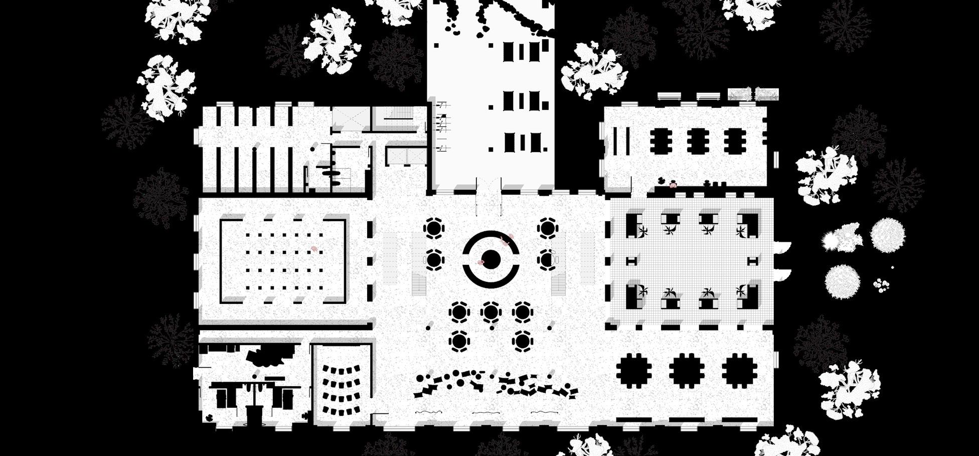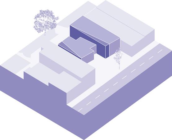 Building split into two masses, one containing the plus and auxiliary programming and the other the library.