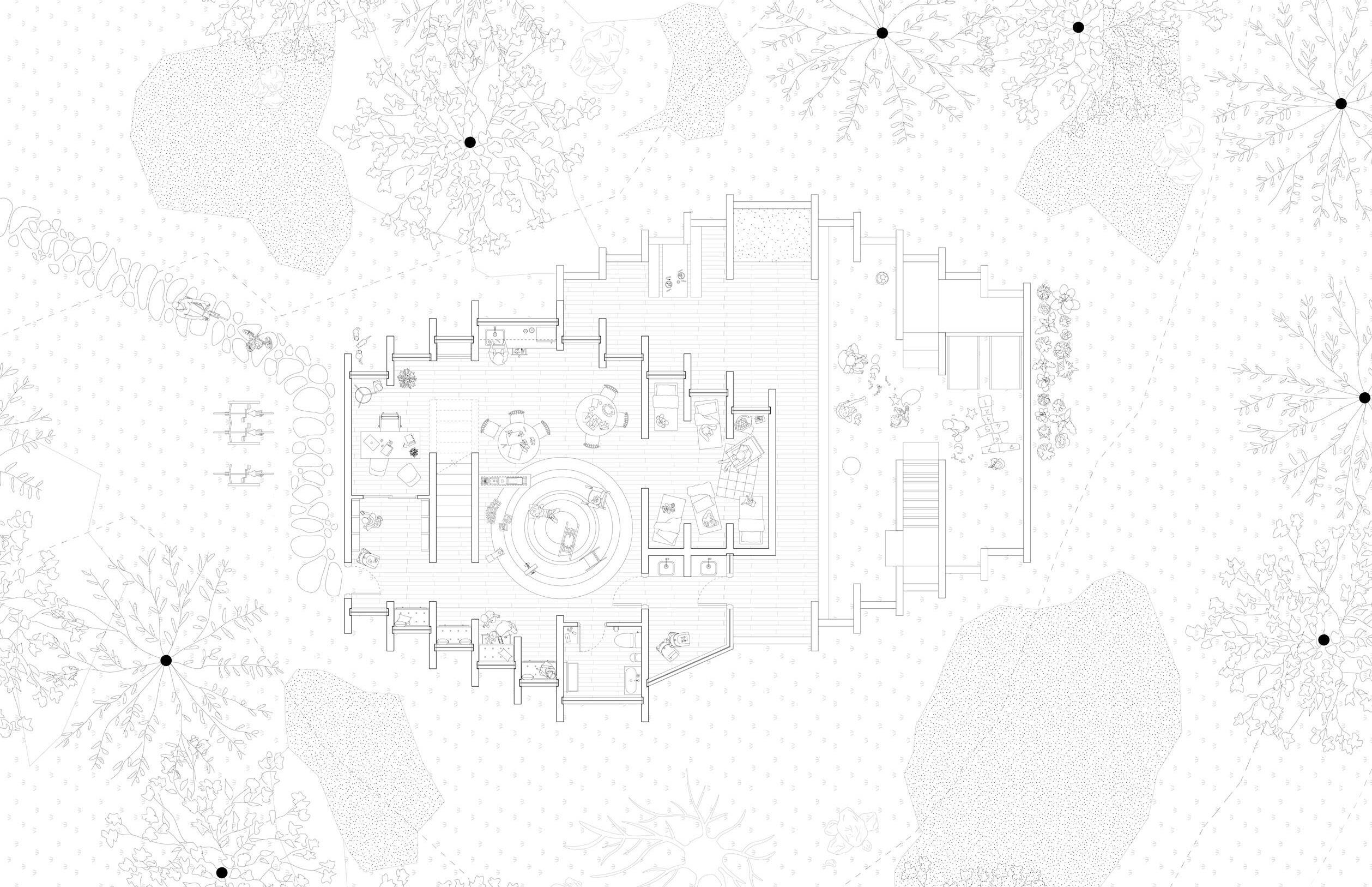 Found by the Grand River in Cambridge, Ontario, Tiny Tots offers the community a daycare for children aged 3 to 6 while doubling as a residence. The building’s diagonal orientation caters to the lighting, where the occupants experience the sun’s movement year long. Walking towards the building following the offset path, occupants gain various interior views because of the extruded fins. These fins create seating and storage space throughout the gross motor area, fit a small kitchen and closet space, and are large enough to place the sleeping mats between. The slight extrusion of the fins in the nap room, obstructing the children’s view from one another when asleep, is also beneficial in preventing distractions.